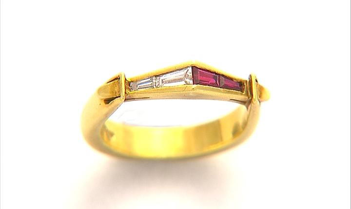 ANELLO. In oro giallo 18 kt sommità a freccia impreziosita da rubini taglio tapered baguette per tot. cts. 0,15 ca. e diamanti taglio tapered baguette per tot. cts. 0,10 ca. incastonati a binario.
