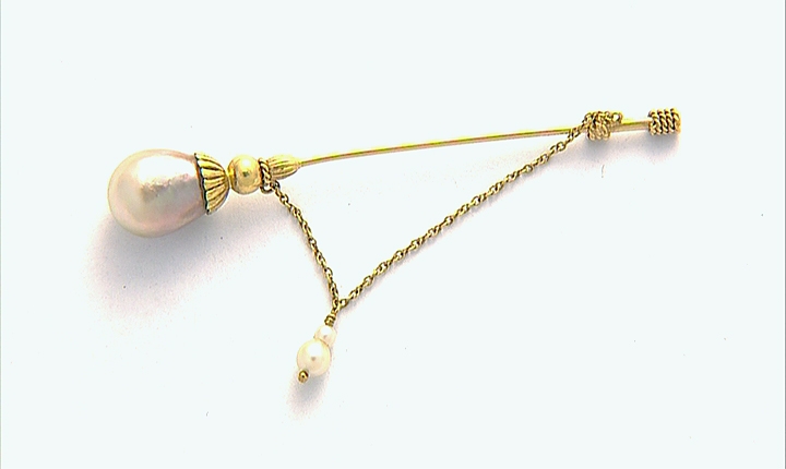 SPILLONE DA GIACCA ANNI '50 CA. In oro giallo 18 kt con decori in filo ritorto, piccole perle coltivate e perla barocca su motivo a coppiglia entro decori costolati.