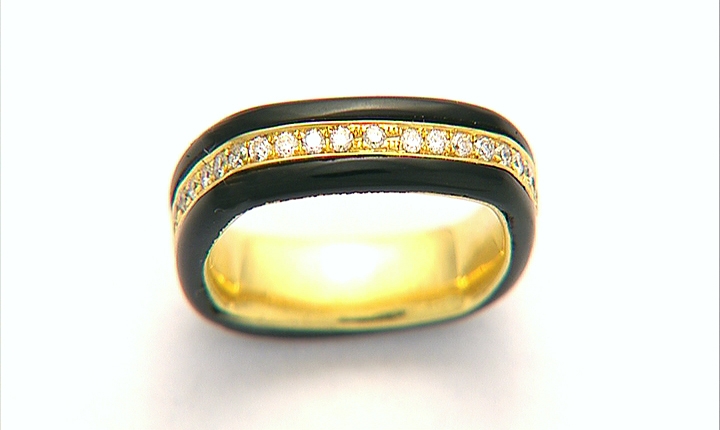 ANELLO ETERNEL. In oro giallo 18 kt percorso al centro da diamanti taglio brillante per tot. cts. 0,50 ca. entro doppio motivo in agata nera.
