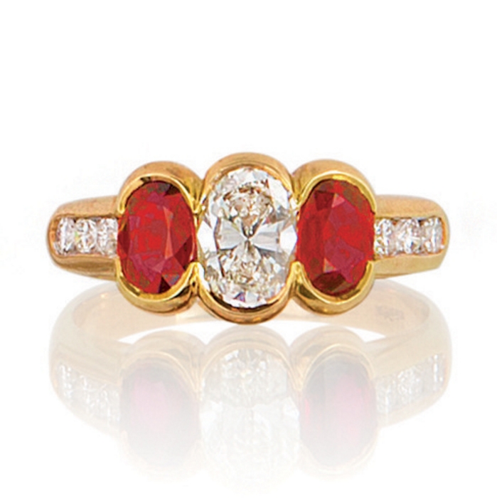 ANELLO. In oro giallo 18 kt centrato da diamante taglio ovale di cts. 0,80 ca. (prob. purezza VVS) entro decori in rubini taglio ovale per tot. cts. 1,20 ca. e diamanti taglio brillante incastonati a binario per tot. cts. 0,25 ca.