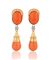 COPPIA DI ORECCHINI PENDENTI. In oro giallo e bianco 18 kt perno e clip realizzati a doppio corpo con inserti in corallo taglio cabochon entro decori in diamanti taglio brillante e huit-huit per tot. cts. 0,80 ca.