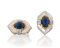 COPPIA DI ORECCHINI. In oro giallo 18 kt e platino a clip, montatura romboidale con al centro zaffiri taglio ovale cabochon per tot. cts. 4,00 ca., inserti in madreperla e diamanti taglio brillante per tot. cts. 0,50 ca. a decoro.