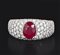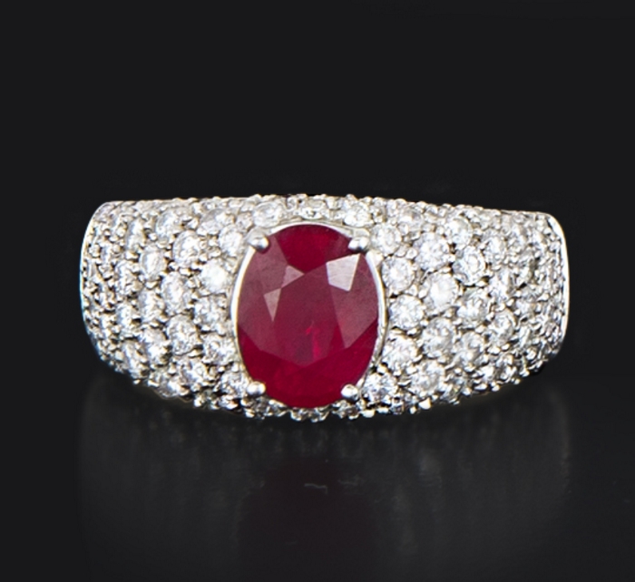 ANELLO. In oro bianco 18 kt internamente foderato, montatura a fascia con rubino taglio ovale di cts. 1,50 ca. entro decoro in diamanti taglio brillante per tot. cts. 1,80 ca.