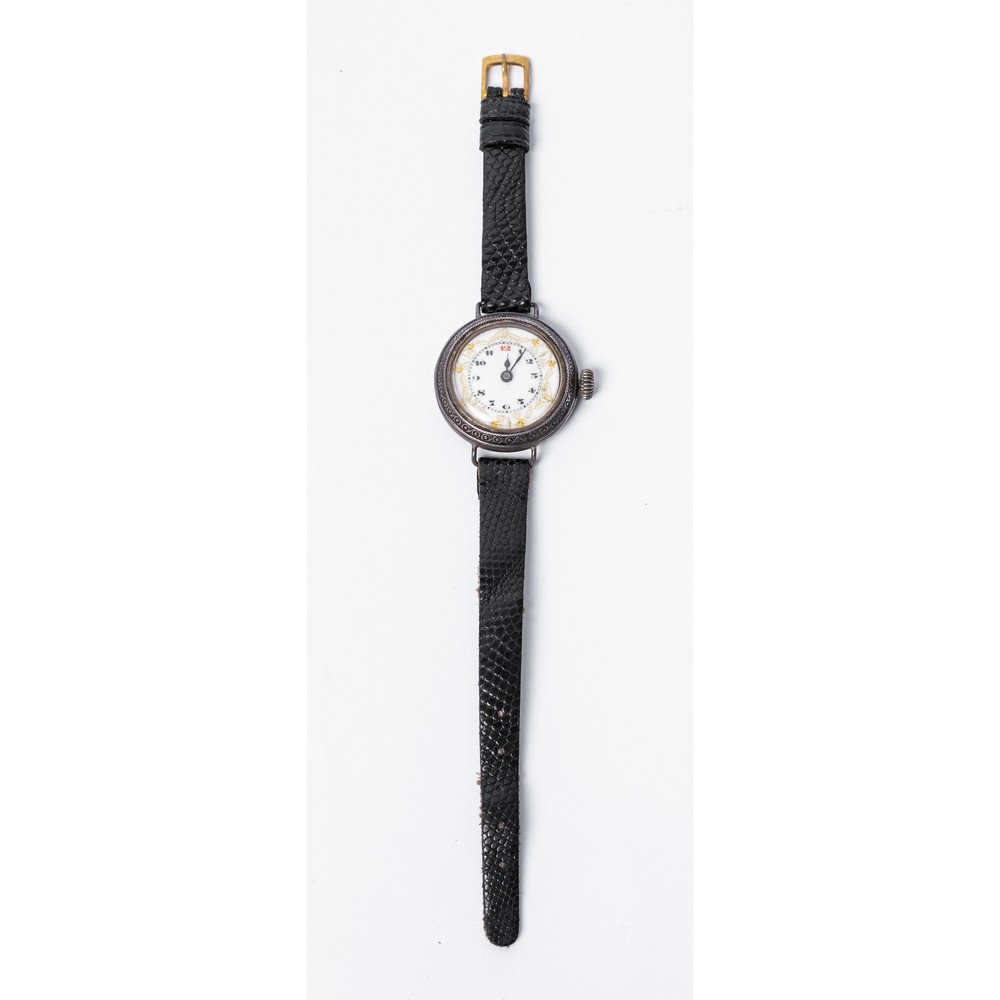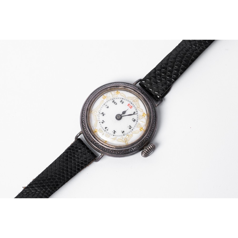 OROLOGIO da polso in argento 925, carica manuale, quadrante smaltato con numeri arabi, cinturino in pelle nera (da revisionare).