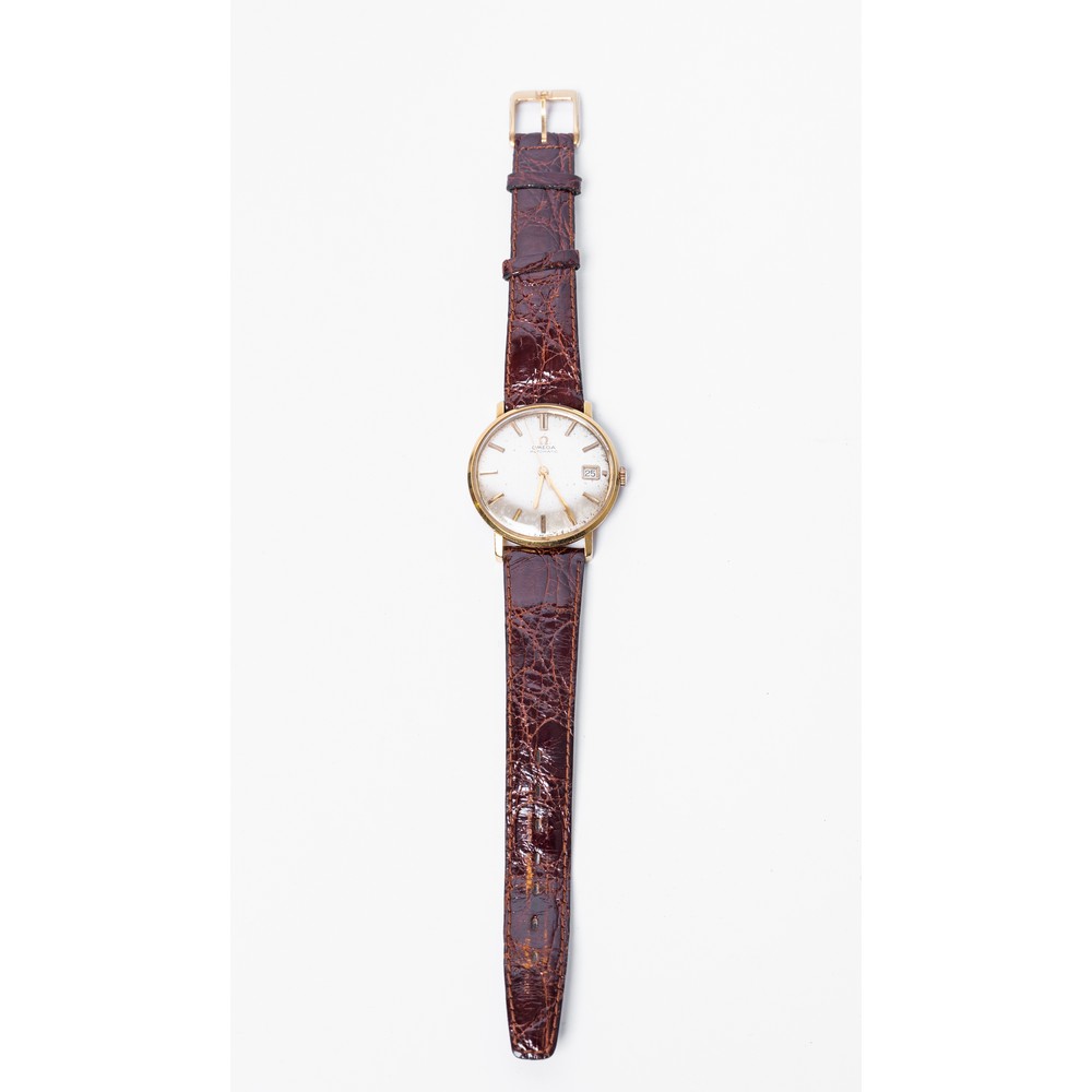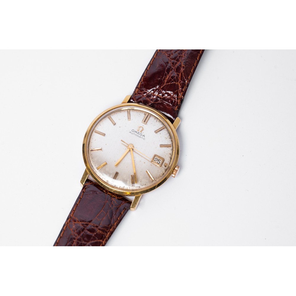 Orologio da polso con cassa in oro giallo 18 KT, movimento automatico, datario, cinturino in pelle marrone originale (da revisionare).