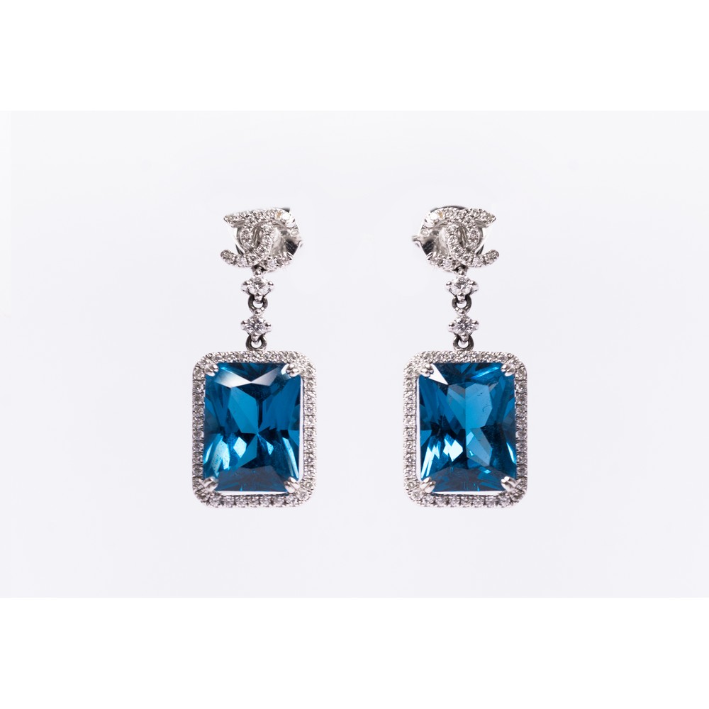 ORECCHINI in oro bianco 18 KT con diamanti taglio brillante ct. 0,61 I color VS1 e pietre di sintesi azzurre (g. 8,20).