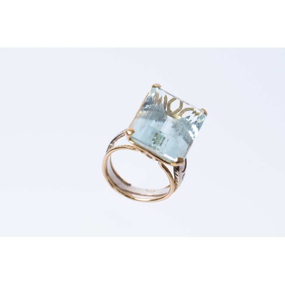 ANELLO in oro bianco e giallo 18 KT con diamante taglio brillante ct. 0,20 peso di stima J COLOR SI1, diamanti taglio huit/huit ct. 0,07 peso di stima e acquamarina naturale taglio gradini di forma ottagonale ct. 29,58 (g. 14,52).
