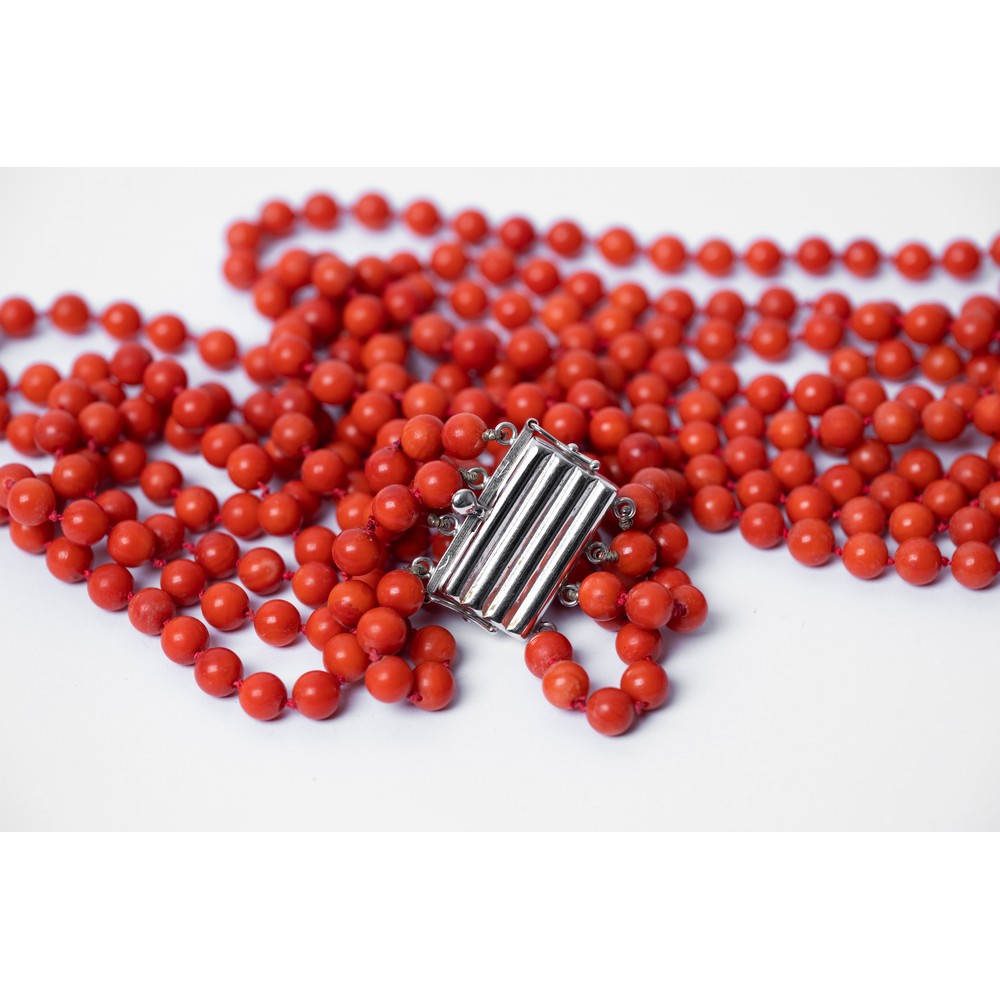 COLLANA a quattro fili di corallo rosso, susta in oro bianco 18 KT (g. 131,60).