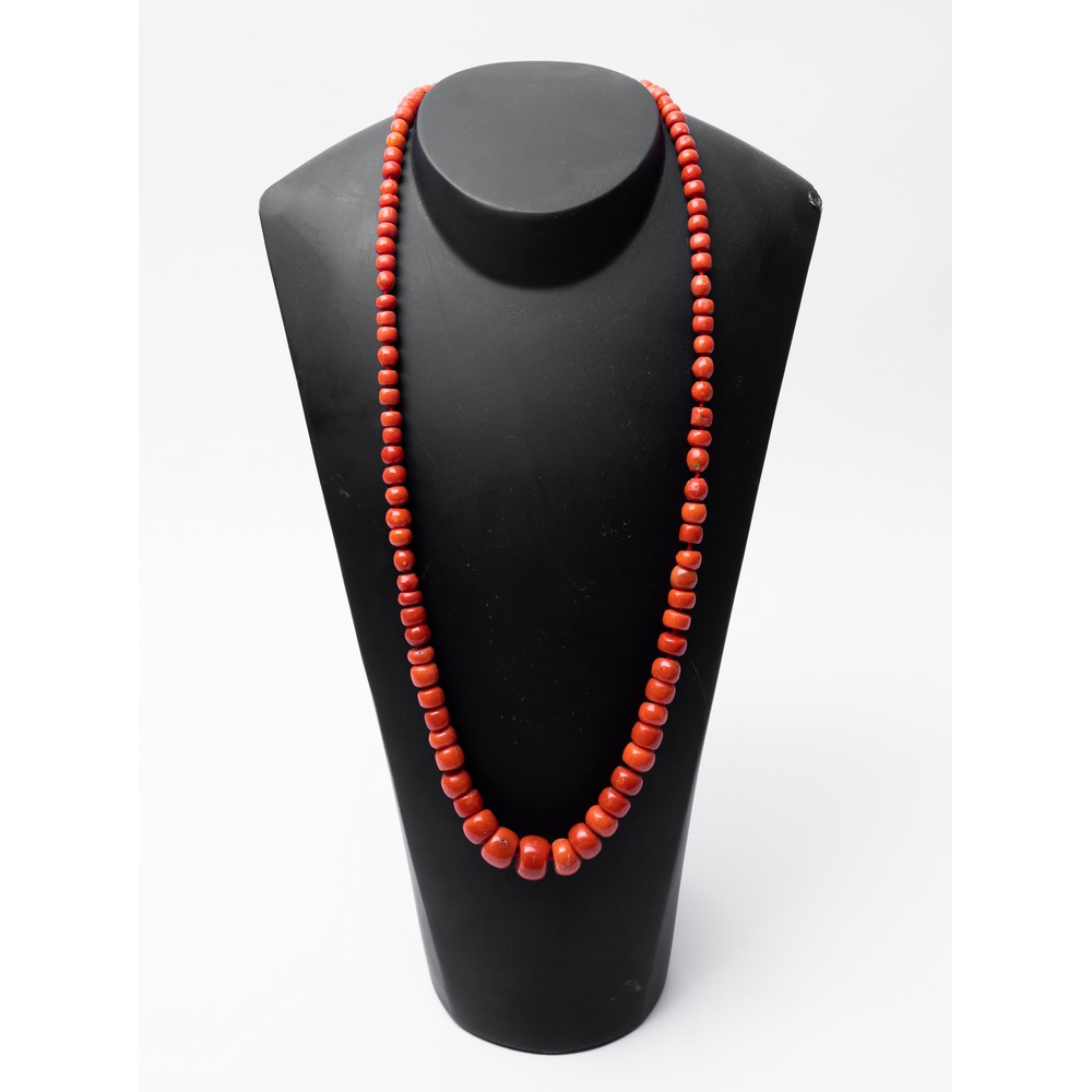 Collana in corallo rosso taglio barilotto a degradare, susta in oro giallo 18 KT con cabochon in corallo (g. 76,53).
