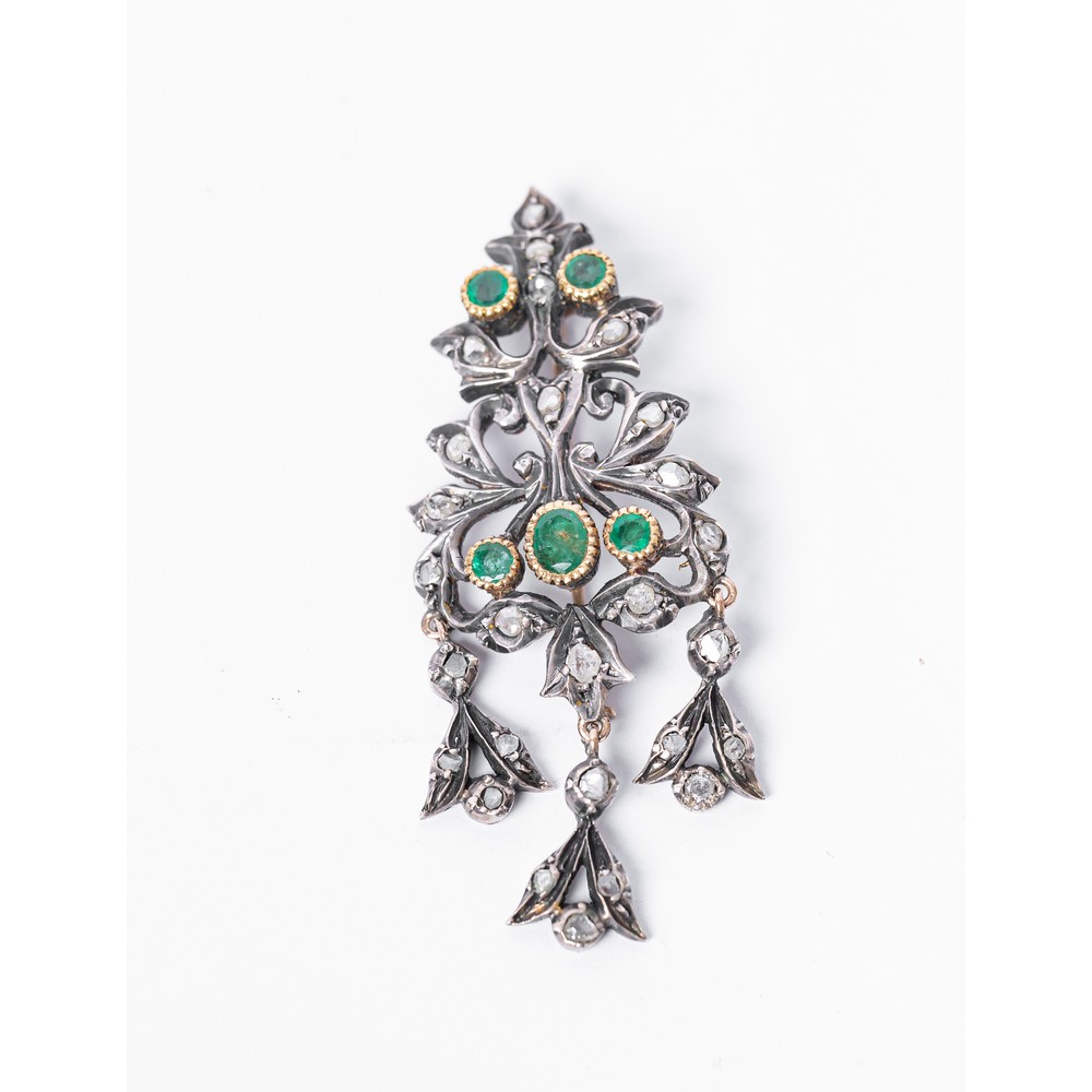 Lot 99 | SPILLA/PENDENTE in oro 9 KT e argento con diamanti e smeraldi