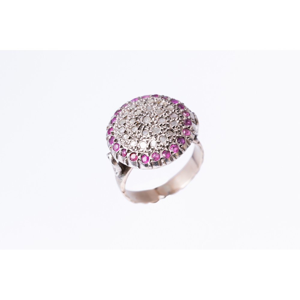 ANELLO a toppa in oro 9 KT e argento con diamanti e rubini
