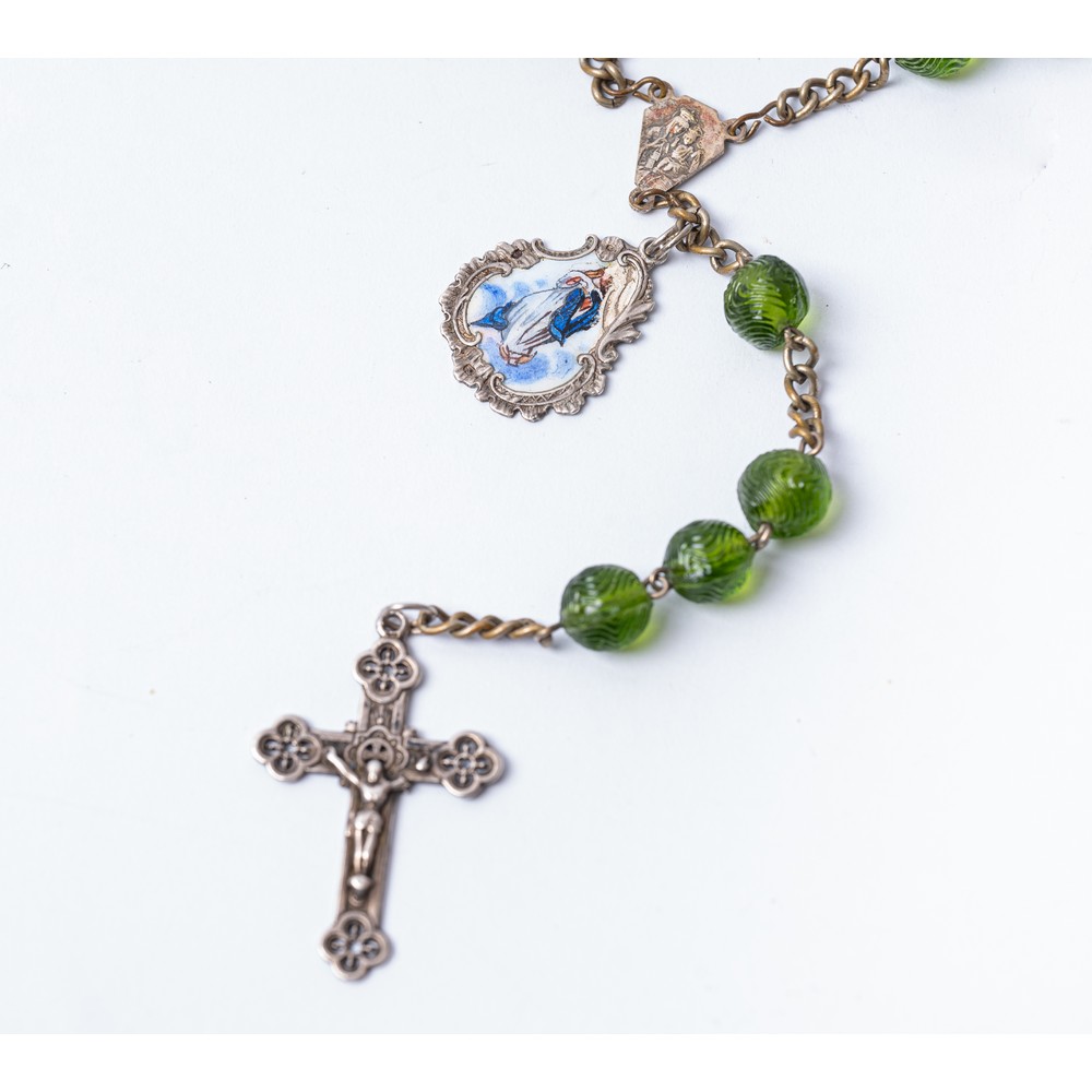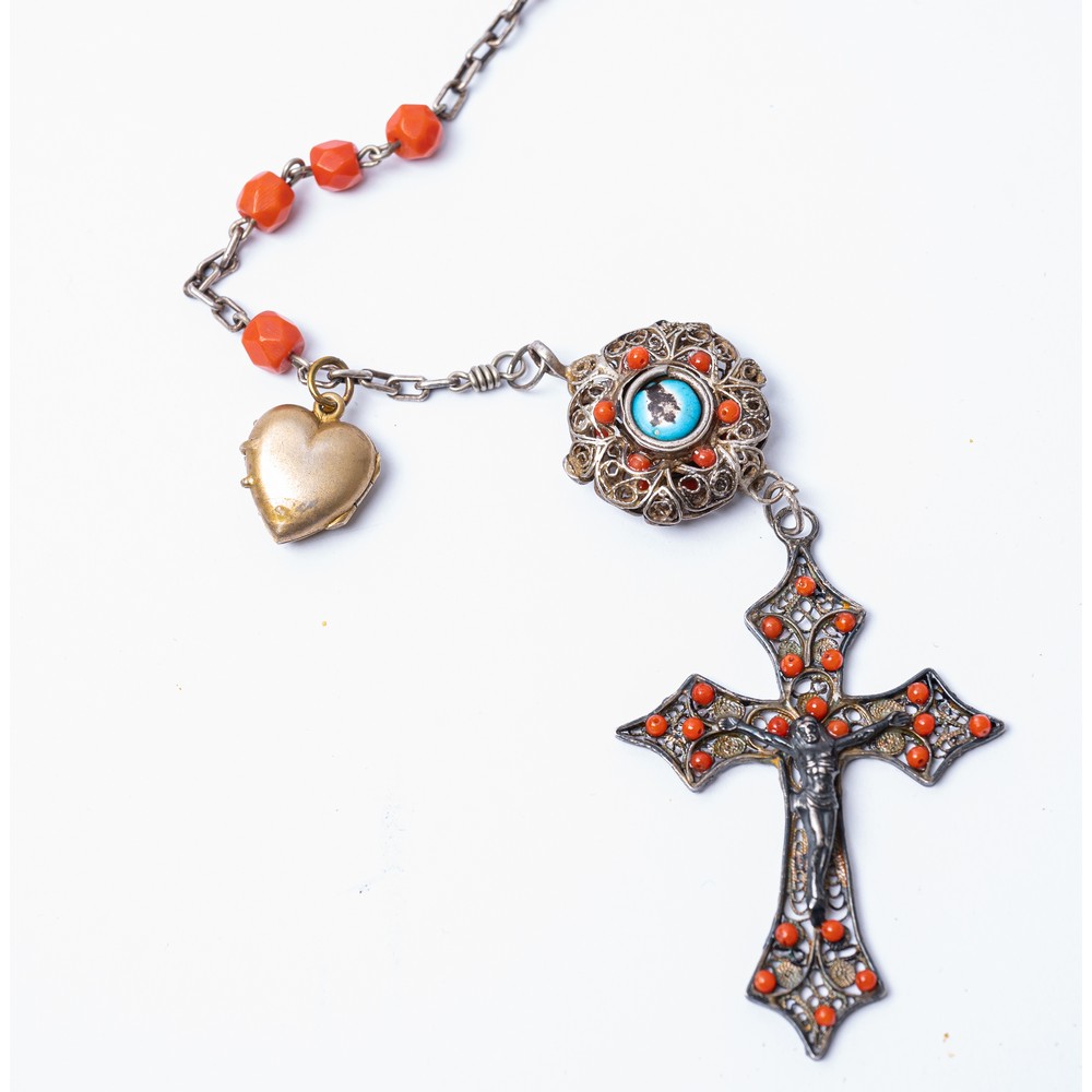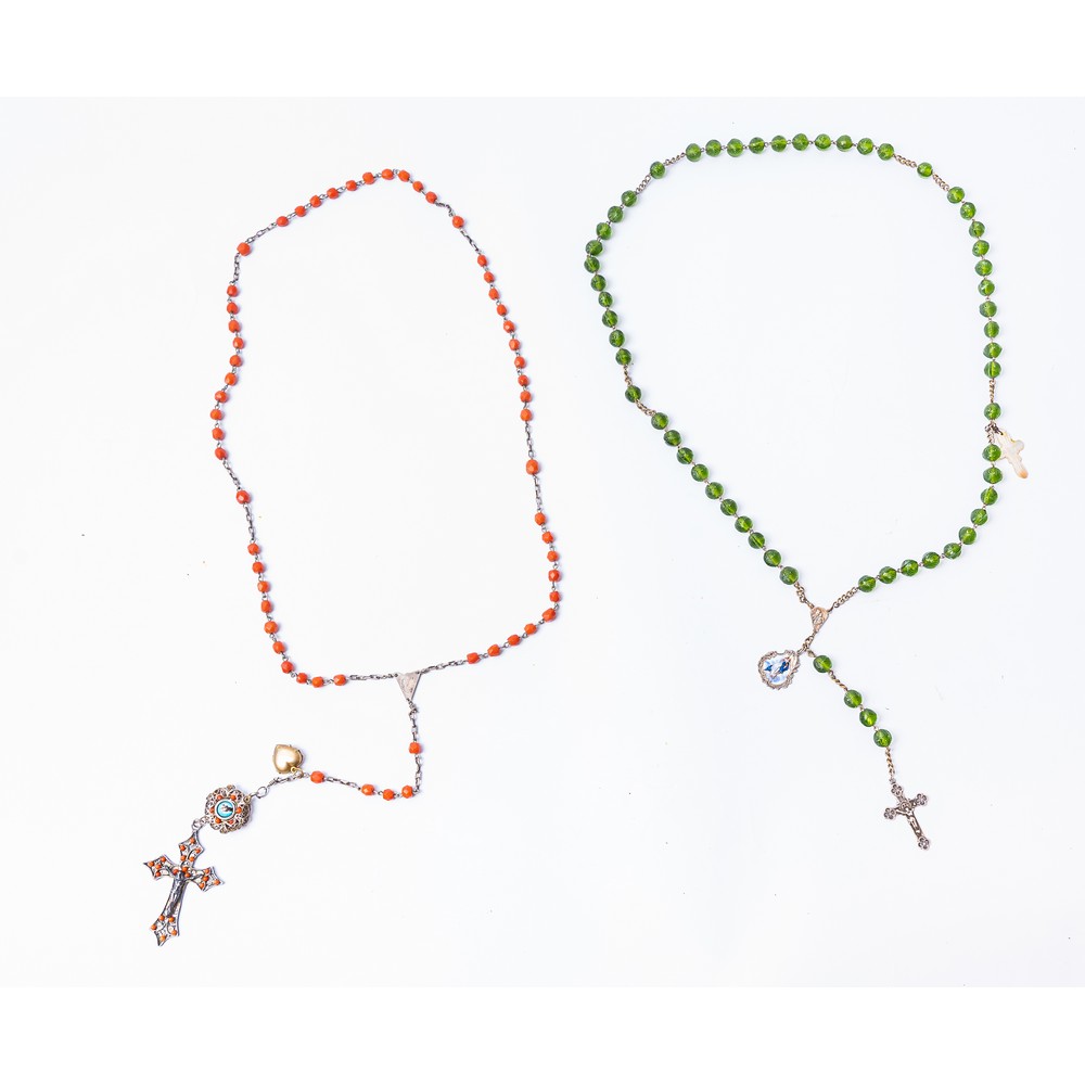 Rosario in filigrana d'argento, metallo, corallo sfaccettato, perline di corallo e smalti ed un rosario in argento, metallo, sfere verdi vitree, smalto e croce in madreperla.