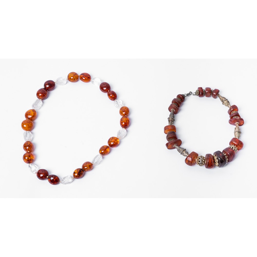 Collana in ambra e argento lavorato (gancio mancante) e collana in ambra e cristallo di rocca (g. 192).