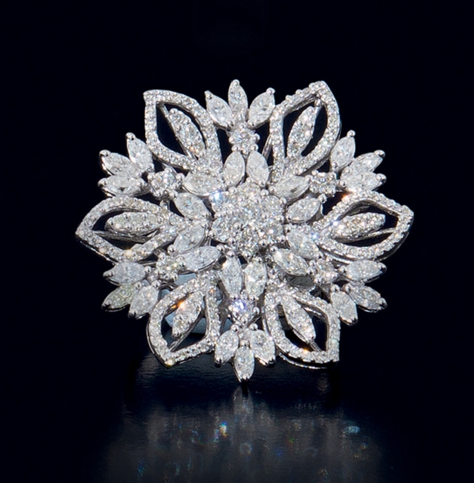 ANELLO. In oro bianco 18 kt sommità a grande fiore internamente foderato impreziosito da diamanti taglio navette e brillante per tot. cts. 2,50 ca.