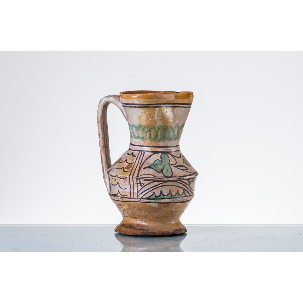 Brocca in maiolica decorata e dipinta nei toni del verde ramina e marrone manganese (restauri).