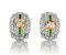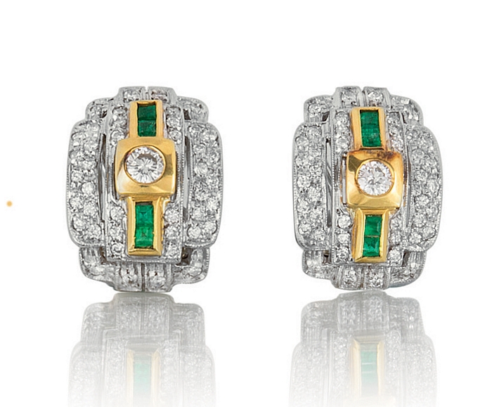 COPPIA DI ORECCHINI DI DAMIANI. In oro giallo e bianco 18 kt, perno e clip di forma rettangolare arcuata con settori gradinati in diamanti taglio brillante per tot. cts. 0,70 ca. e smeraldi taglio carrè per tot. cts. 0,25 ca.