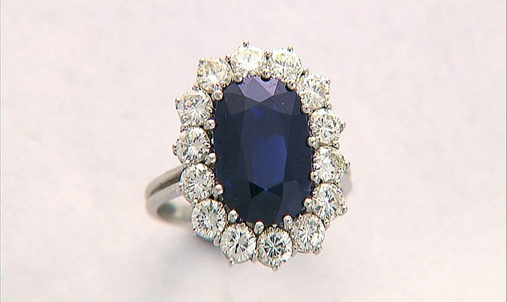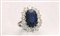 ANELLO. In oro bianco 18 kt sommità a fiore con al centro zaffiro taglio ovale di cts. 4,50 ca. entro cornice in diamanti taglio brillante per tot. cts. 2,10 ca.