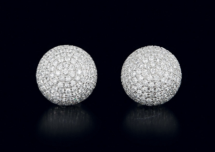 COPPIA DI ORECCHINI. In oro bianco 18 kt perno e farfalla, montatura a boule interamente in pavè di diamanti taglio brillante per tot. cts. 5,70 ca.