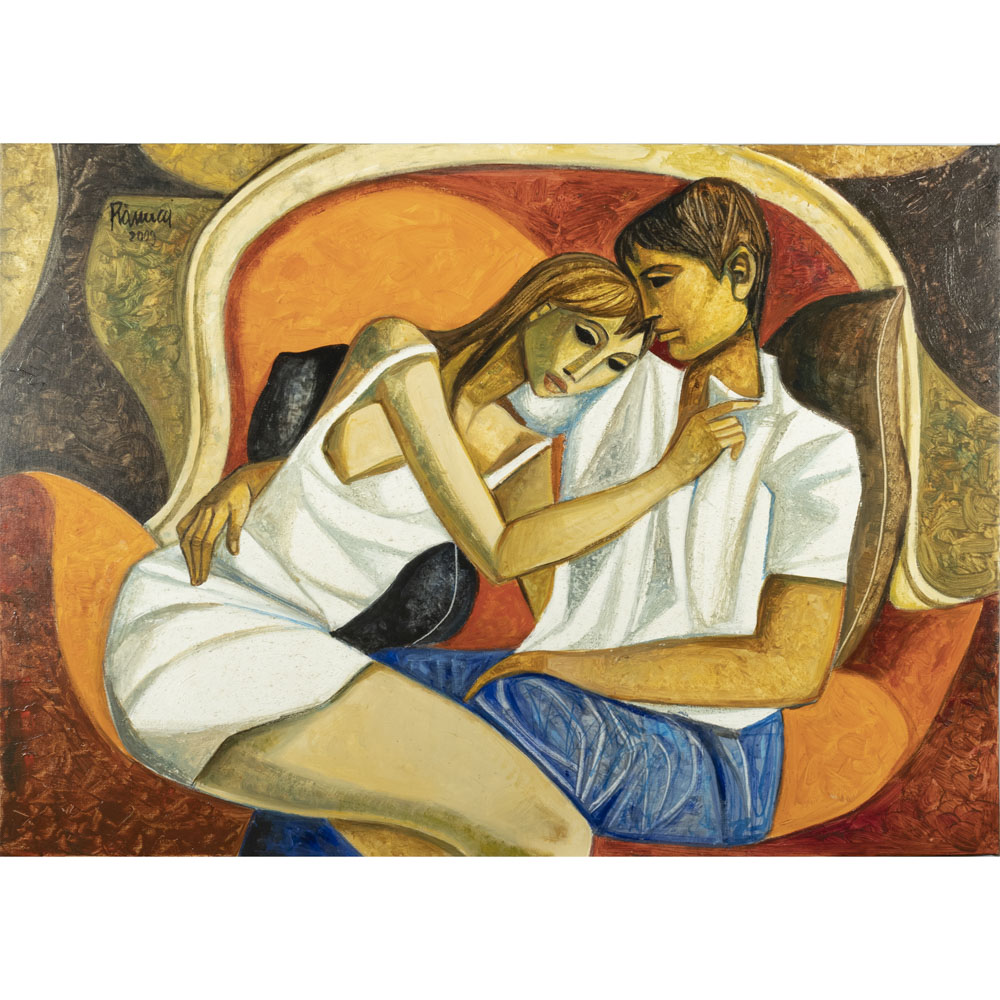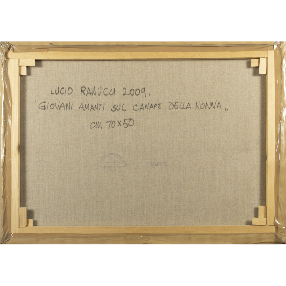 Lucio Ranucci (Perledo 1925 - Saint Paul de Vence 2017) "Giovani amanti sul canape della nonna" 2009 50x70 cm.