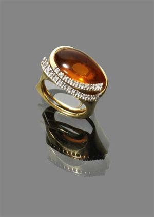 ANELLO Anello in oro giallo e riporto in oro bianco con quarzo citrino a forma di goccia taglio cabochon e diamanti taglio brillante per complessivi ct 0,20 ca Peso gr 17,20 yellow white gold ring with cabochon cut, drop shaped quartz citrine and brillant cut diamonds totaling approx 0,20 kt Weight 17.20 gr
