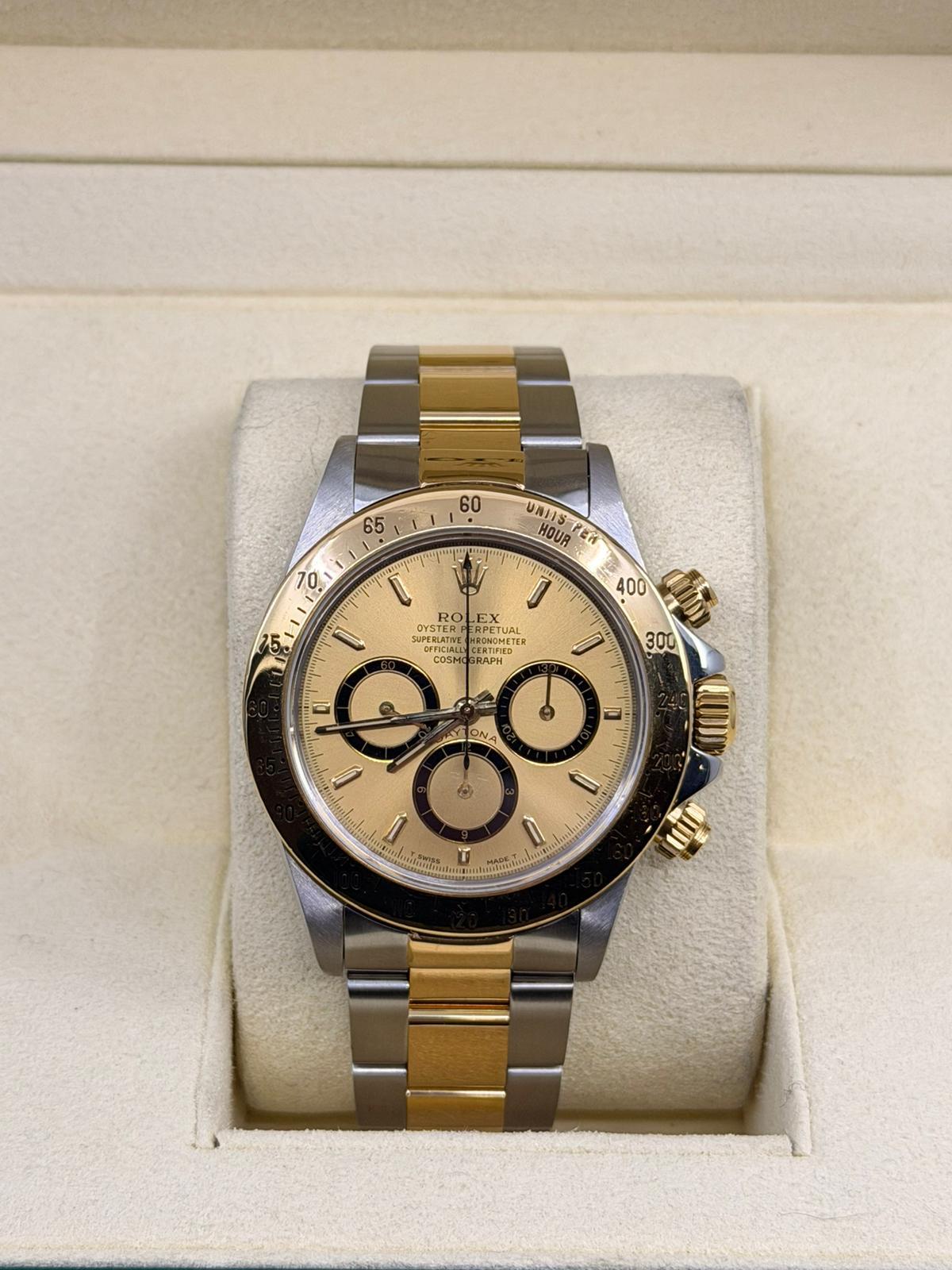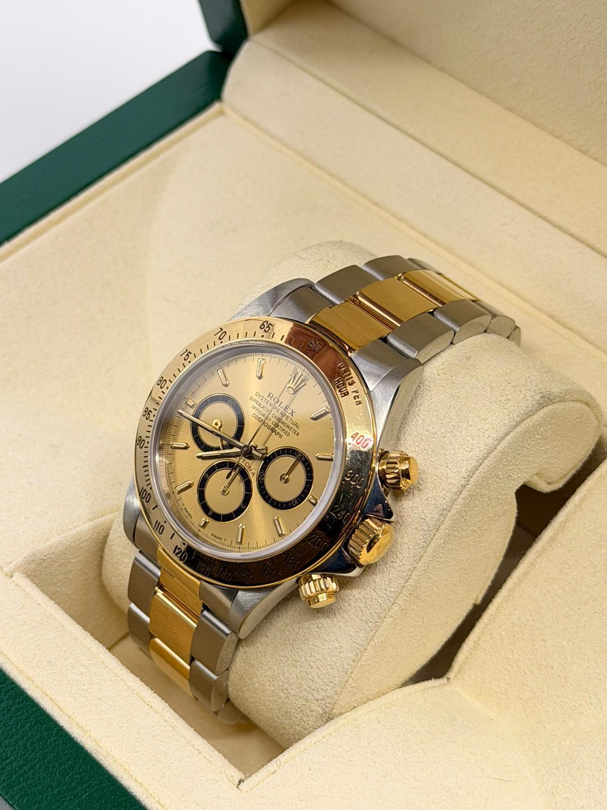Marca Rolex Modello (Orologio) Daytona Numero di referenza 16523 6 rovescio Carica Automatico Anno 1992 Materiale della cassa Oro/Acciaio Materiale cinturino Oro/acciaio Corredo documenti originali, no box Carica Automatico Cassa Materiale della cassa Oro/Acciaio Diametro 40 mm Impermeabile 10 ATM Materiale lunetta Oro giallo Vetro Vetro zaffiro Cinturino Materiale cinturino Oro/acciaio Colore cinturino Oro/acciaio Chiusura Déployante Materiale chiusura Oro/Acciaio - COMMISSIONE D’ASTA 25%