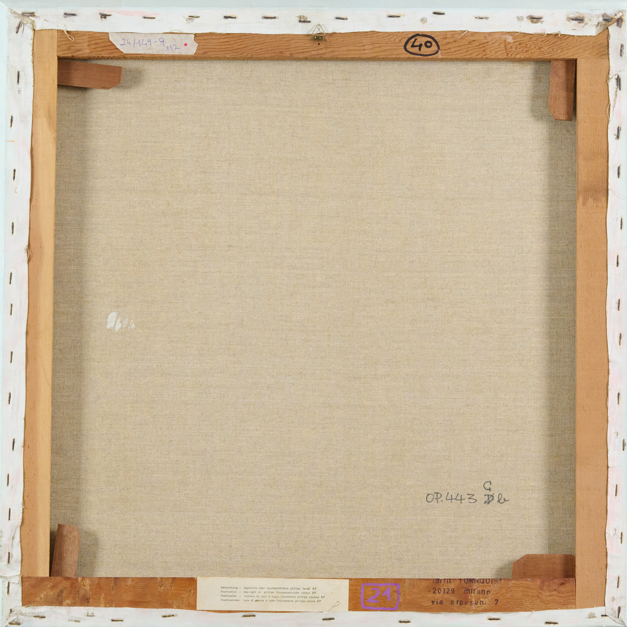 Timbro dell'Artista ed etichetta con indicazioni per l'illuminazione delle opere.