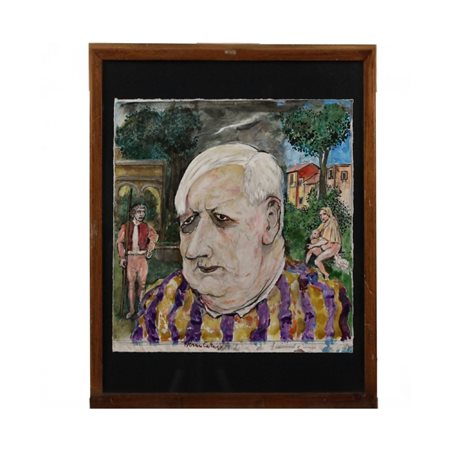 Bruno Caruso (1927/2018) "Giorgio de Chirico nella tempesta di Giorgione" China, acquerello e tempera su carta. Autentica Archivi "Bruno Caruso" Palermo Palermo. Cm 26,5x28