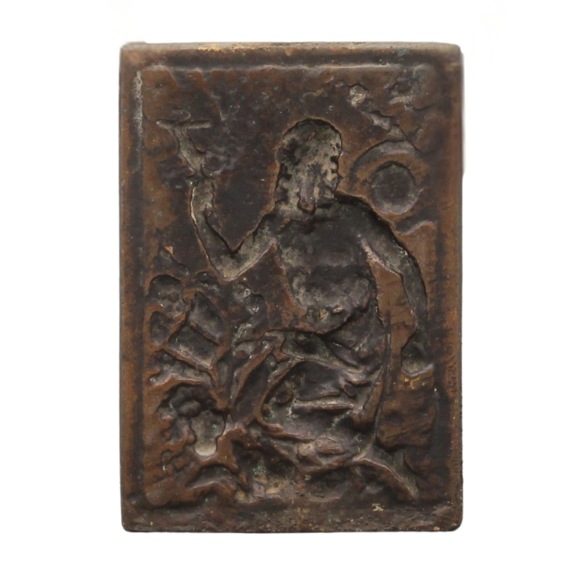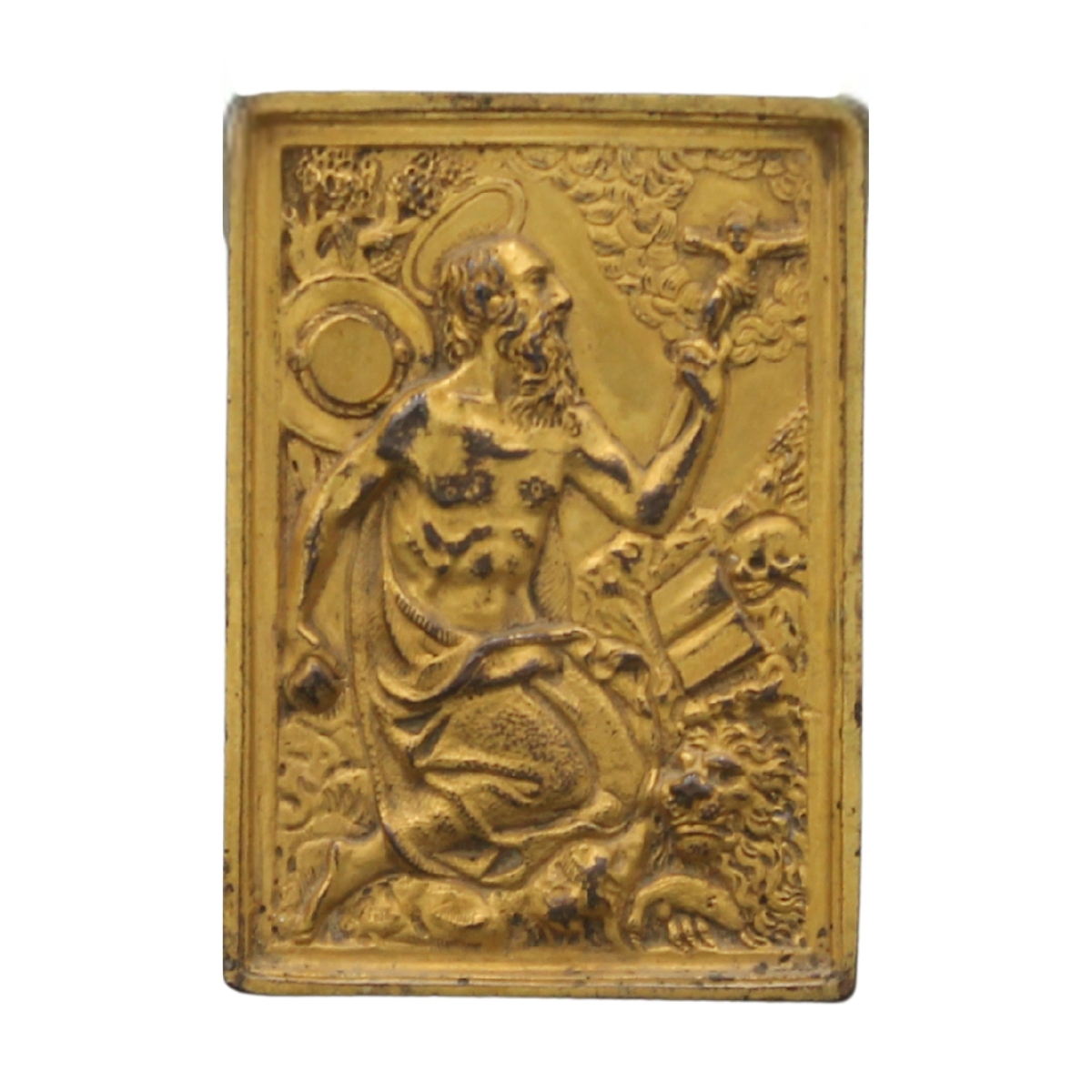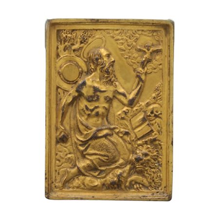 "San Girolamo" Raffinata placca in bronzo finemente inciso e dorato. Fine secolo XVII. Cm 9,5x7