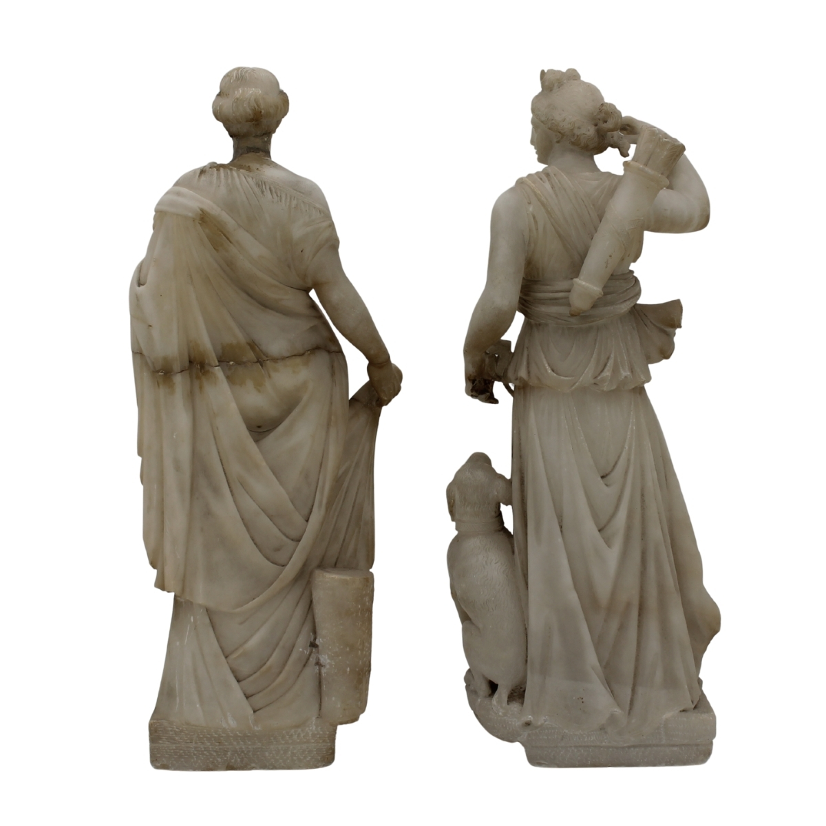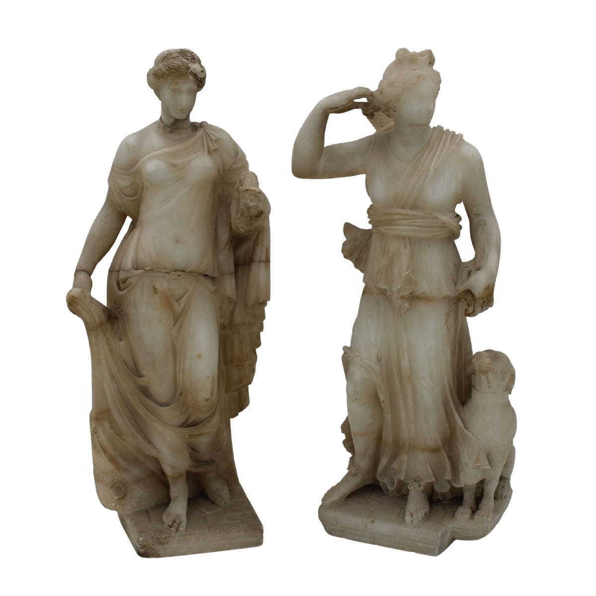 Diana e Flora Due statue in alabastro scolpito con decoro a motivi ornamentali (danni). Francia. Inizi secolo XIX. Cm h 46