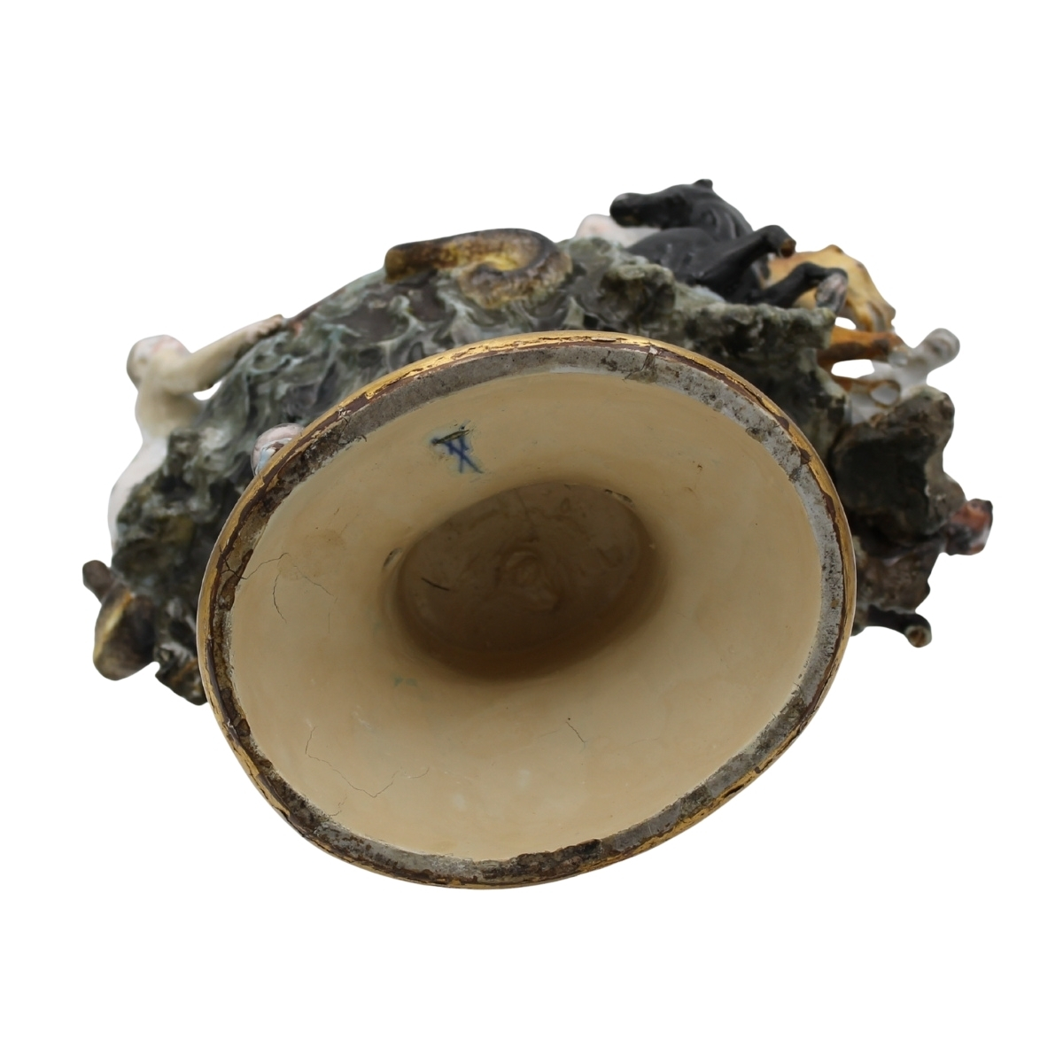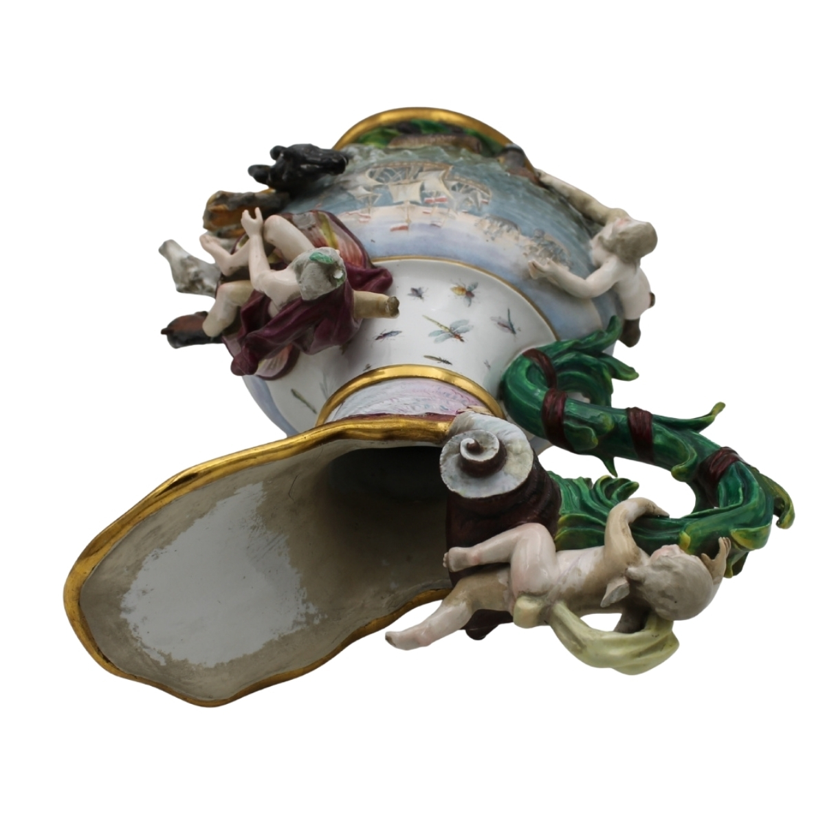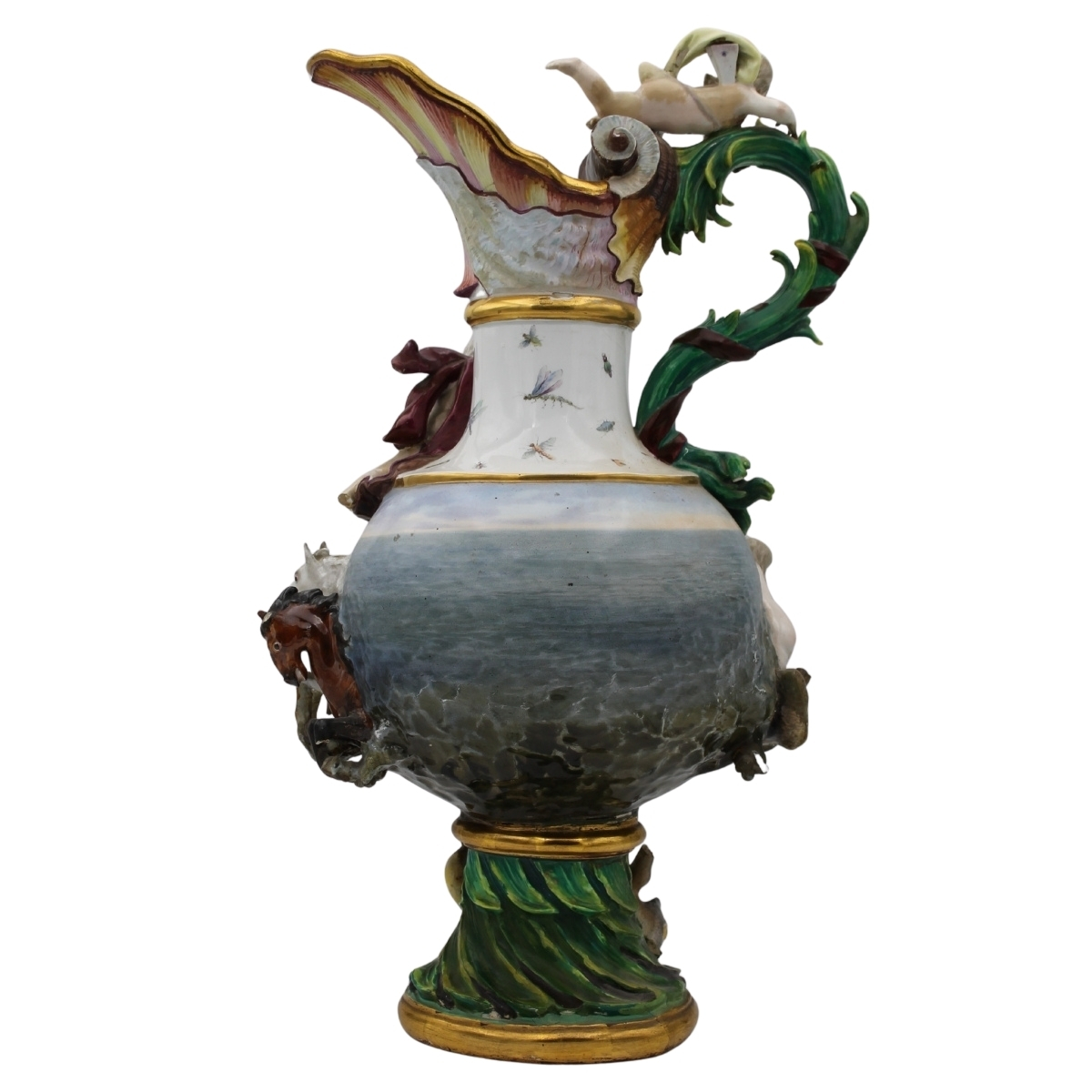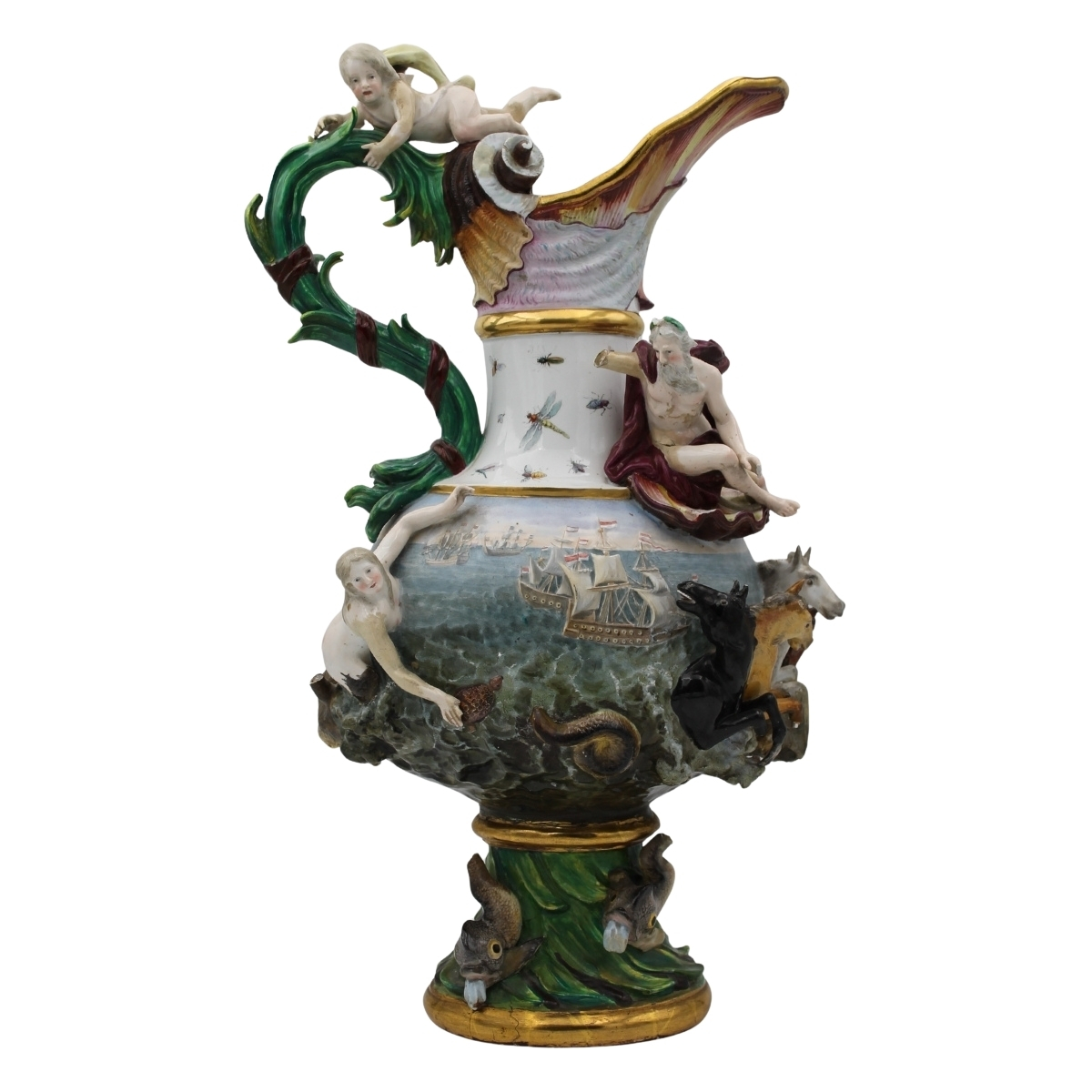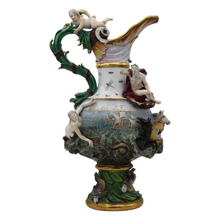 Grande ed importante brocca Antica porcellana con decoro a figure mitologiche a rilievo (mancanze ed evidenti restauri). Decoro a tutto tondo con scene di battaglie navali. Maissen. Seconda metà del secolo XIX. Cm h 63