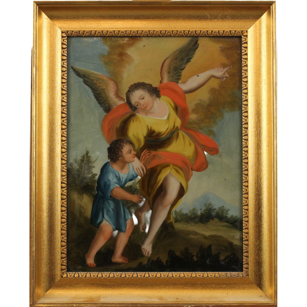 Scuola siciliana degli inizi del secolo XIX "Tobiolo e l'Angelo" Dipinto ad olio su vetro in cornice in legno dorato (cornice non antica). Cm 44x33