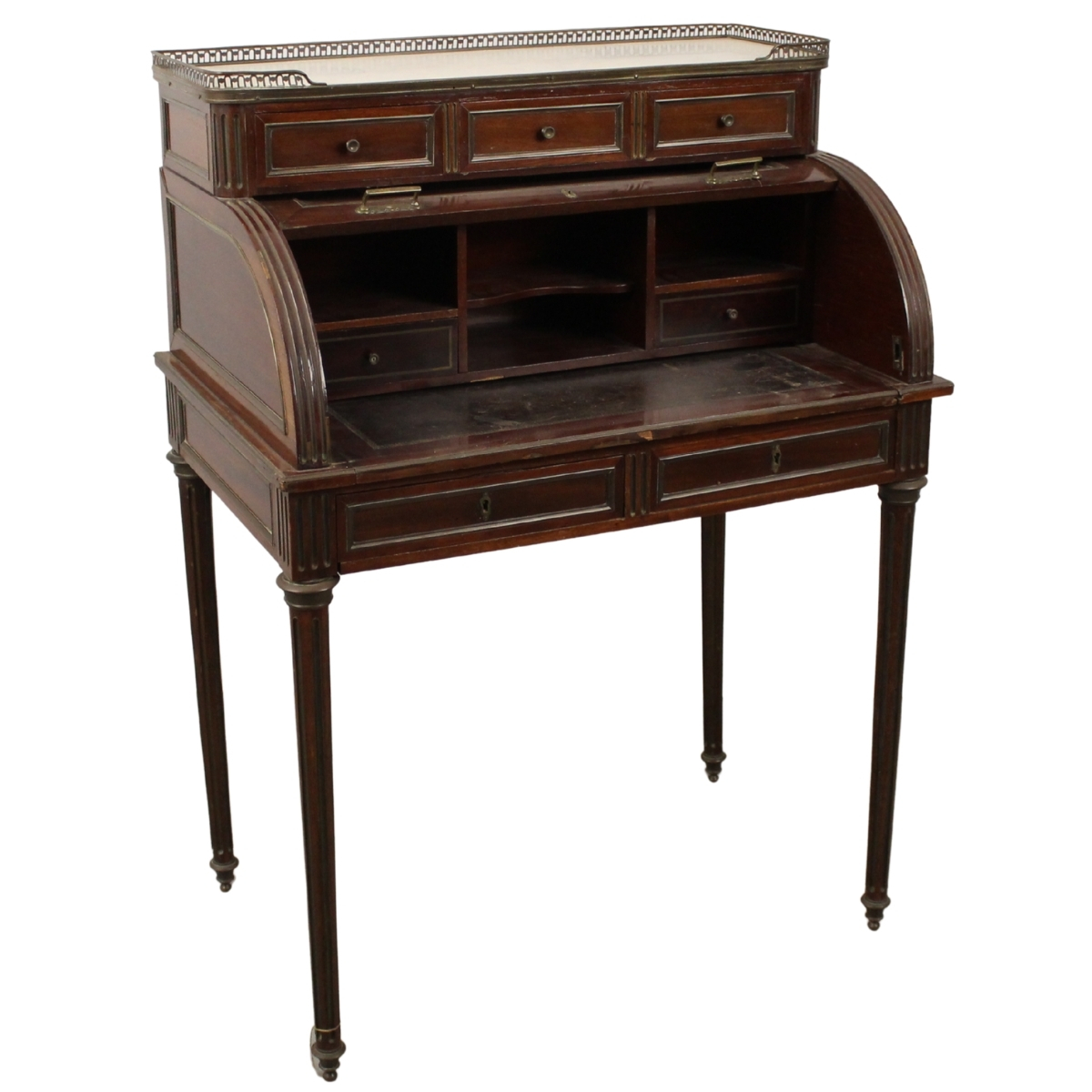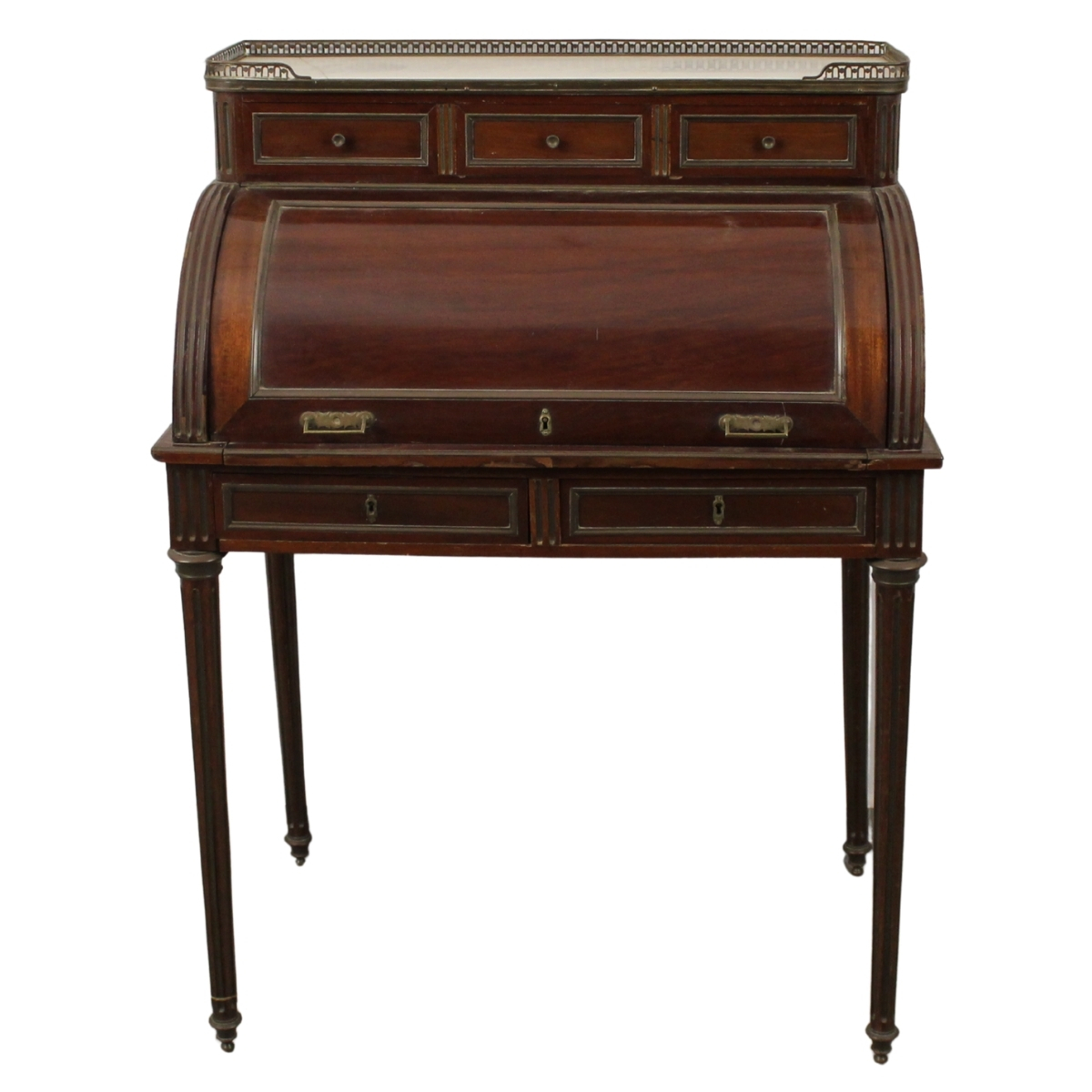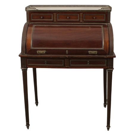 Piccolo bureau a rullo Mogano con tre cassetti nella parte inferiore. Piano in marmo bianco incassato e applicazioni di metallo dorato (danni). Francia. Epoca Napoleone III. Cm 80,5x51x111
