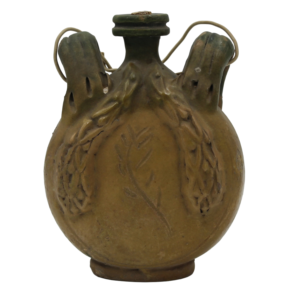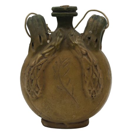 Fiaschetta Antica maiolica con decoro frontale a motivi ornamentali policromi. Collesano. Inizi secolo XX. Cm h 20