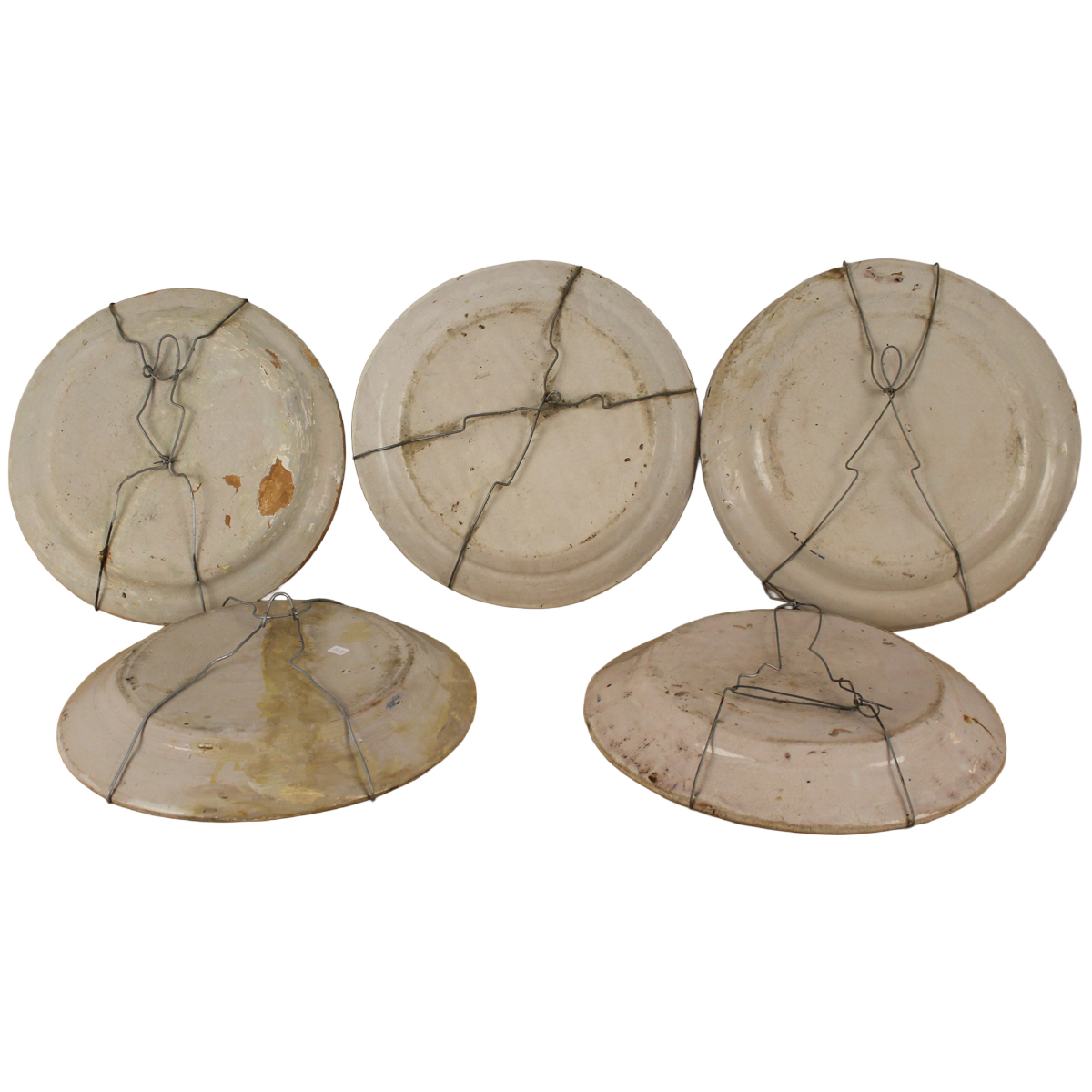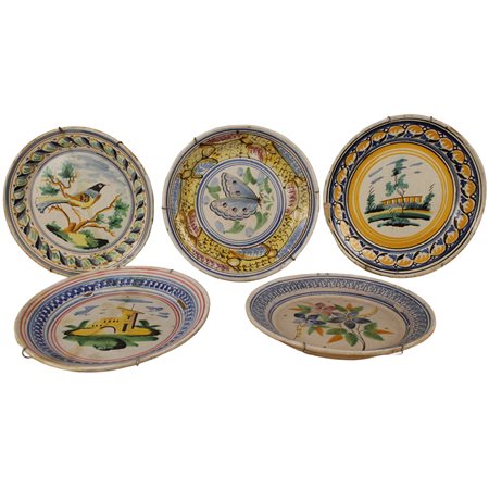Lotto di cinque grandi piatti Antica maiolica policroma con decori a motivi floreali, paesaggi copn casolari e volatili (restauri e rotture su due dei cinque). Italia meridionale. Metà del secolo XIX. Cm d43 circa