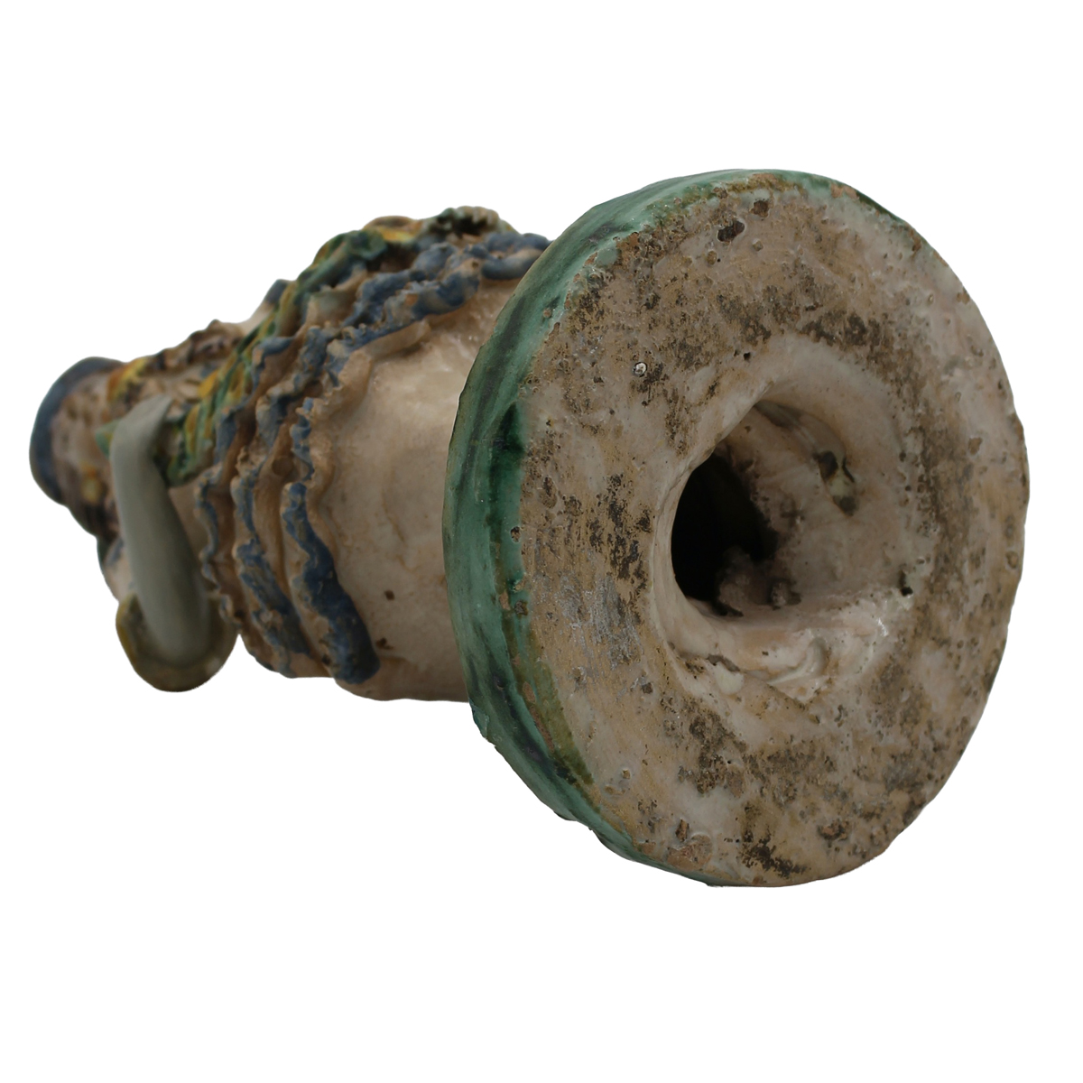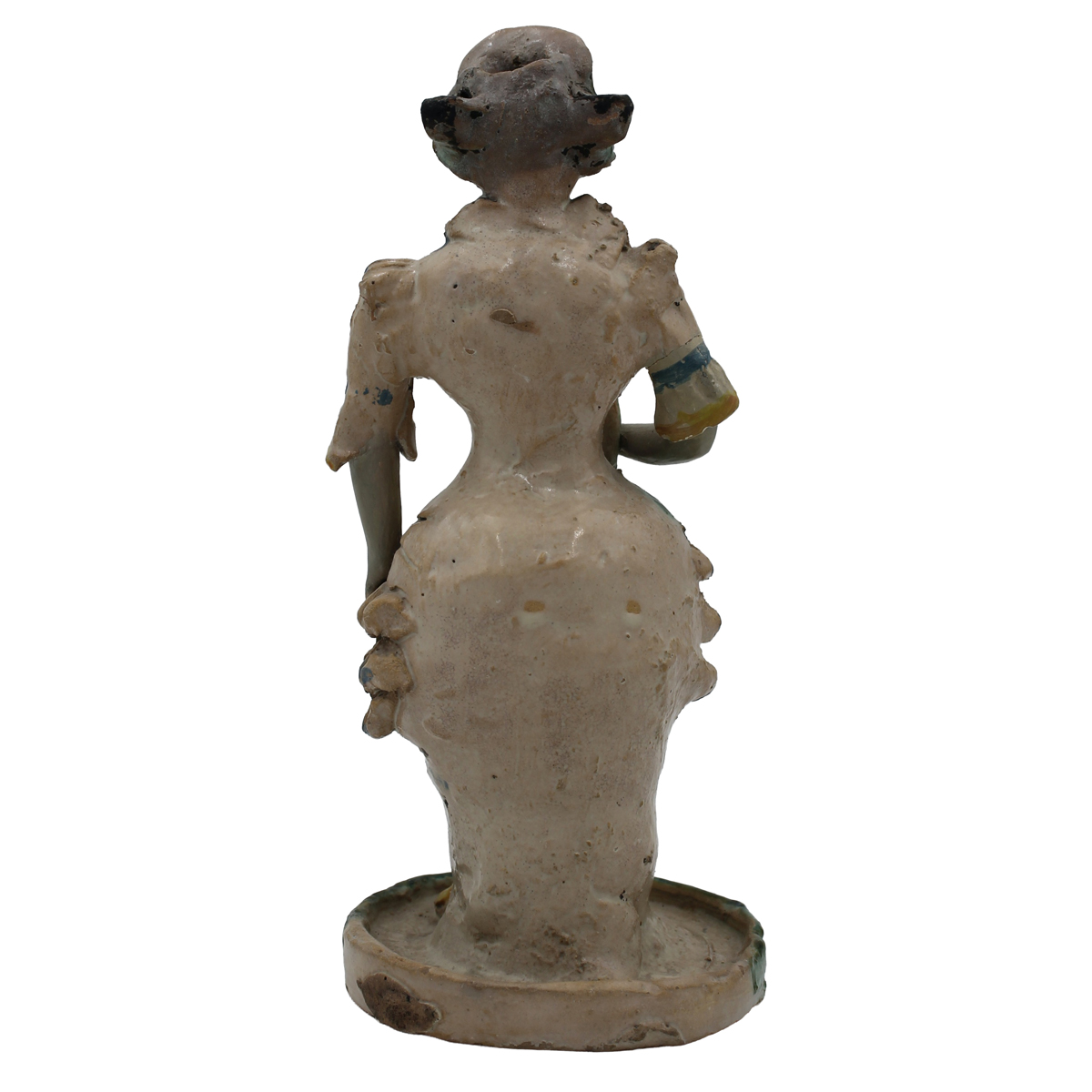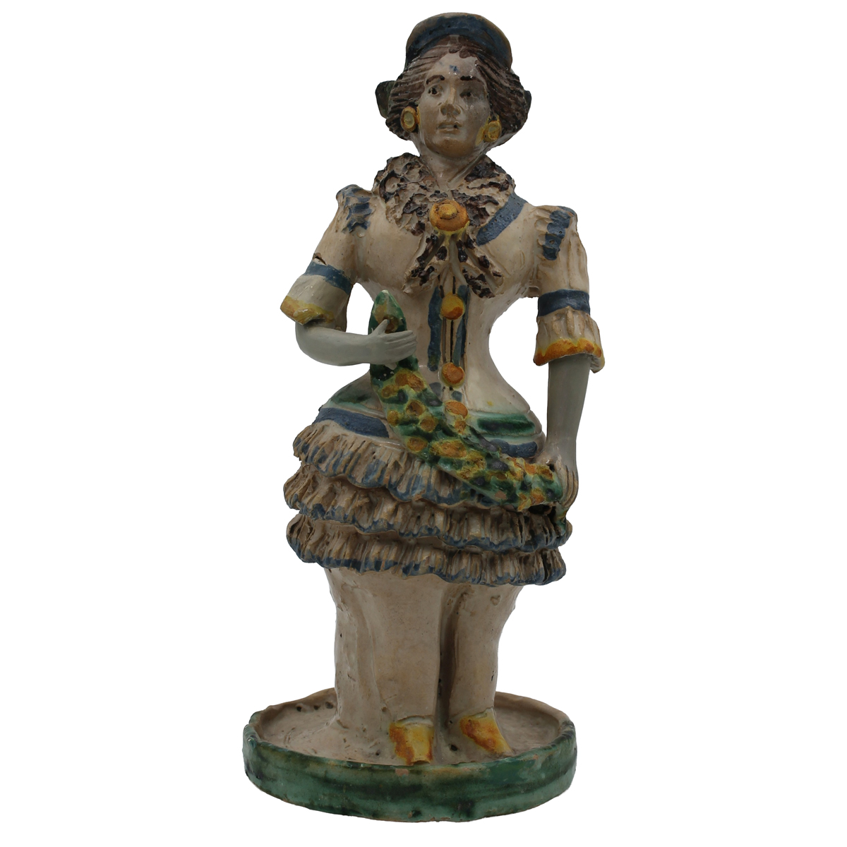 Lucerna "Donna con ghirlanda" Antica maiolica con decoro a motivi ornamentali policromi su fondo crema (braccia ricostruite). Caltagirone. Secolo XIX. Cm h 33