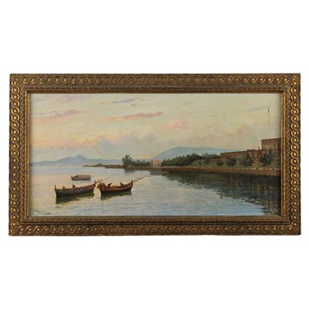 Antonio Caliri (XIX/XX)"Lungo mare di Palermo" Dipinto ad olio su tela in cornice in legno dorato (danni alla tela). Cm 40x80