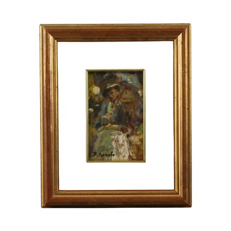 Romolo Garrone (1891/1959) "Donna con ombrello" Dipinto ad olio su tavola in cornice. Cm 14x9