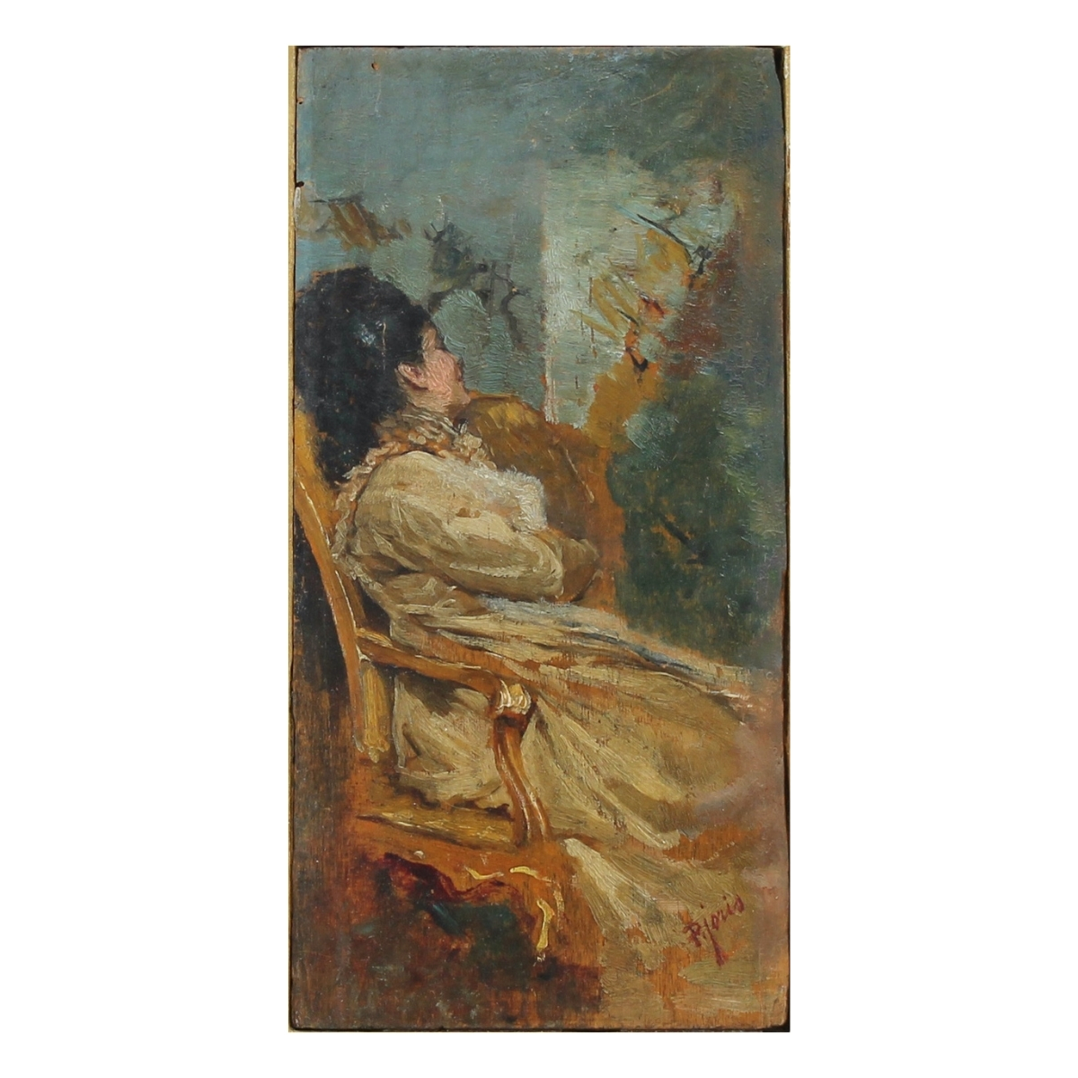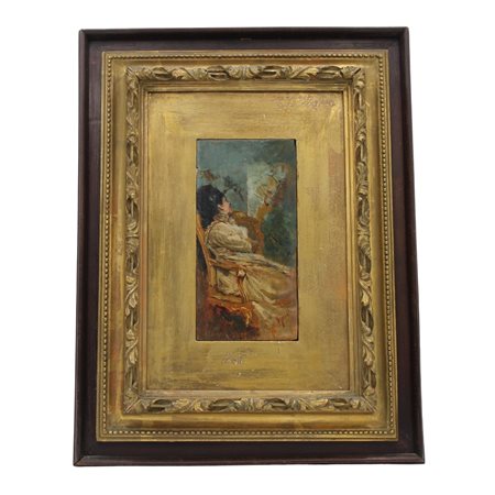Pio Joris (1843/1921) "Figura femminile a riposo" Olio su tavola in cornice. Sul retro antica autentica. Cm 20x10