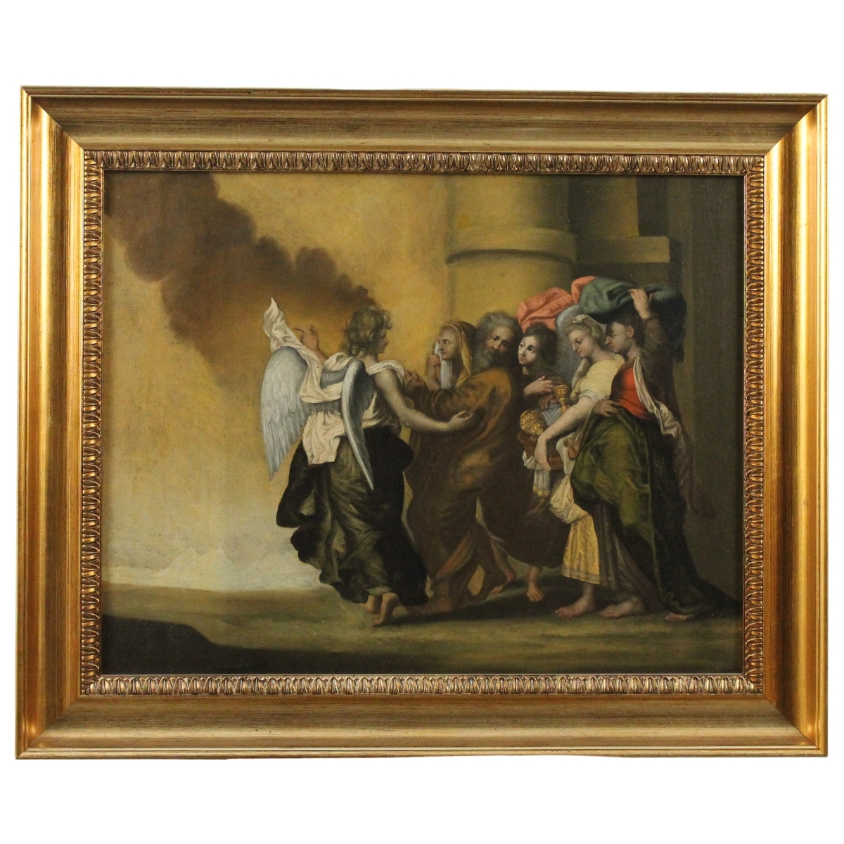Scuola italiana del secolo XIX "Lot e le figlie" Dipinto ad olio su tela in cornice in legno dorato (restauri, rifoderato e ritelaiato). Cm 61x78