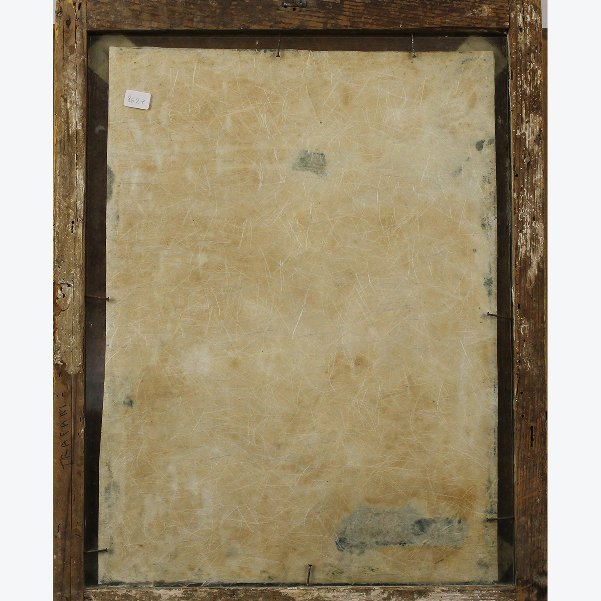 Scuola siciliana del secolo XVIII "Sacra famiglia" Dipinto ad olio su carta in cornice in legno inciso e dorato. Cm 44x32