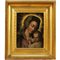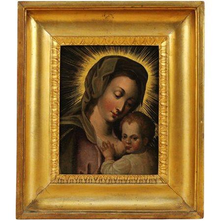 Scuola siciliana del secolo XVII "Madonna con Bambino" Dipinto ad olio su rame in cornice in legno dorato a canna spaccata (piccoli restauri). Cm 23,5x18,5