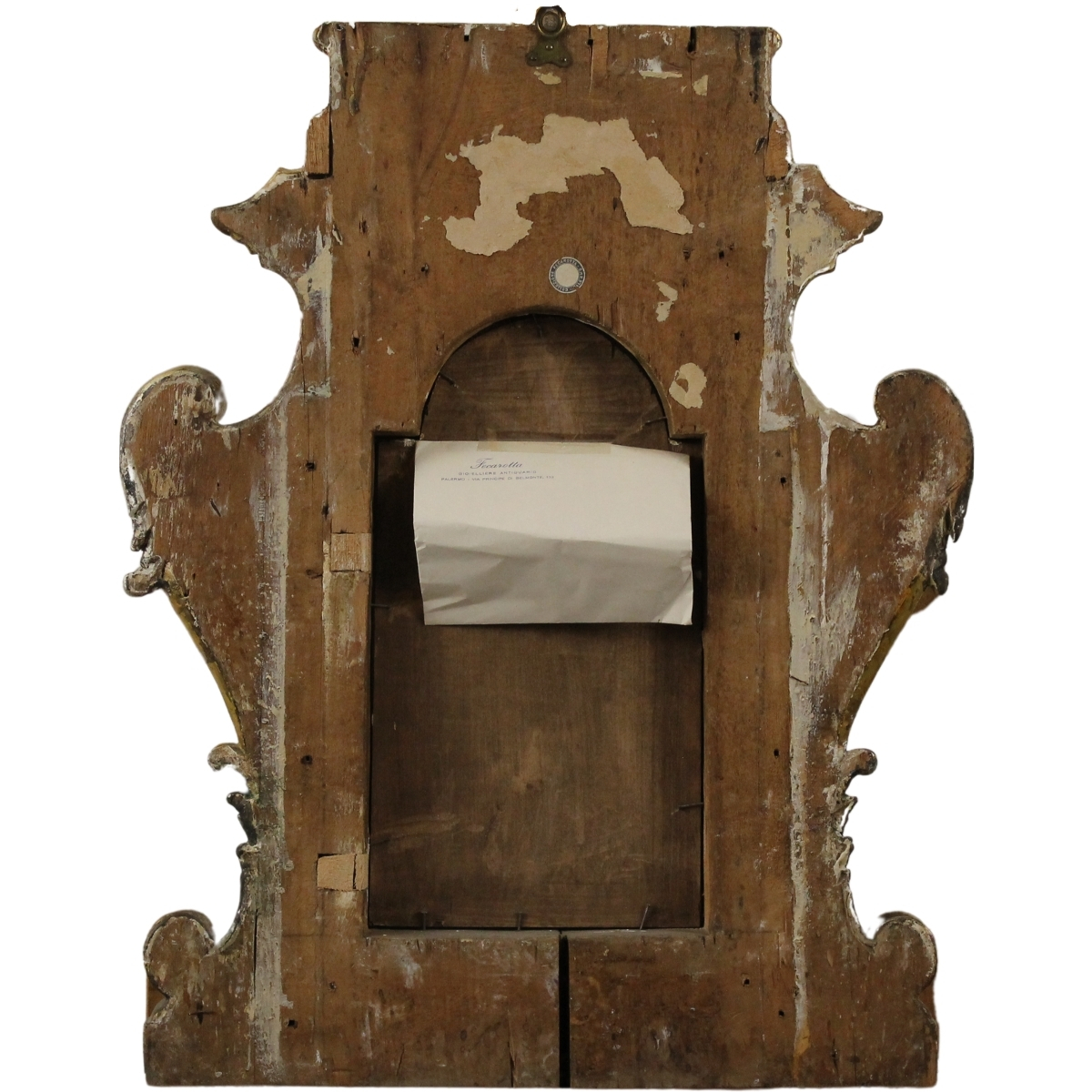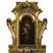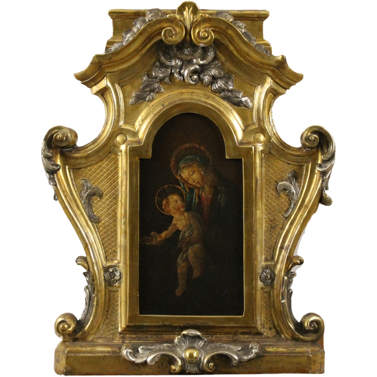 "Madonna con bambnino" Dipinto ad olio su tavola (del secolo XX) inserito in particolare cornice finemente scolpita in legno dorato e argentato del secolo XVIII. Sicilia. Cm 48x60x7 (cornice, misure esterne); cm 35x19 (dipinto)