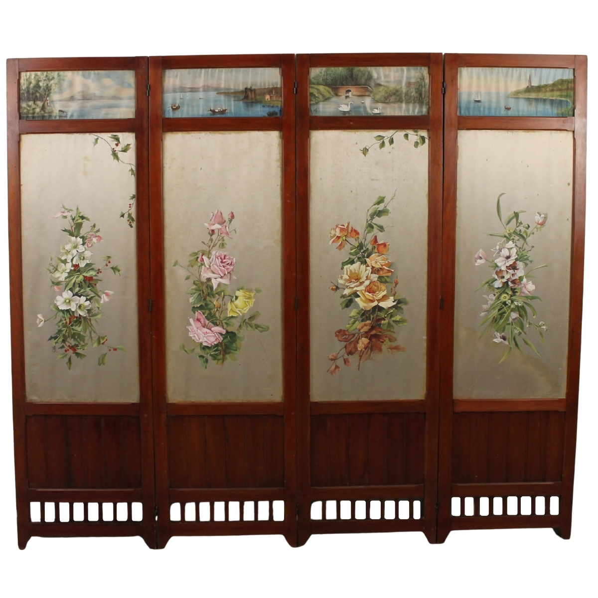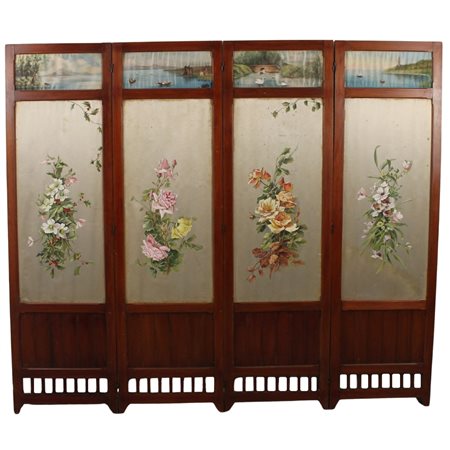 Kiyohara Tama (1861/1939) "Paravento" Pannelli dipinti su seta raffiguranti paesaggi marini, lacustri e motivi floreali. Siglato. Cm 208x180