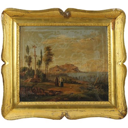 Andrea Sottile (1802/1856) (attr.) "Veduta di Palermo" Dipinto ad olio su tela in cornice a vassoio in legno dorato (danni alla tela e restauri). Cm 41x48