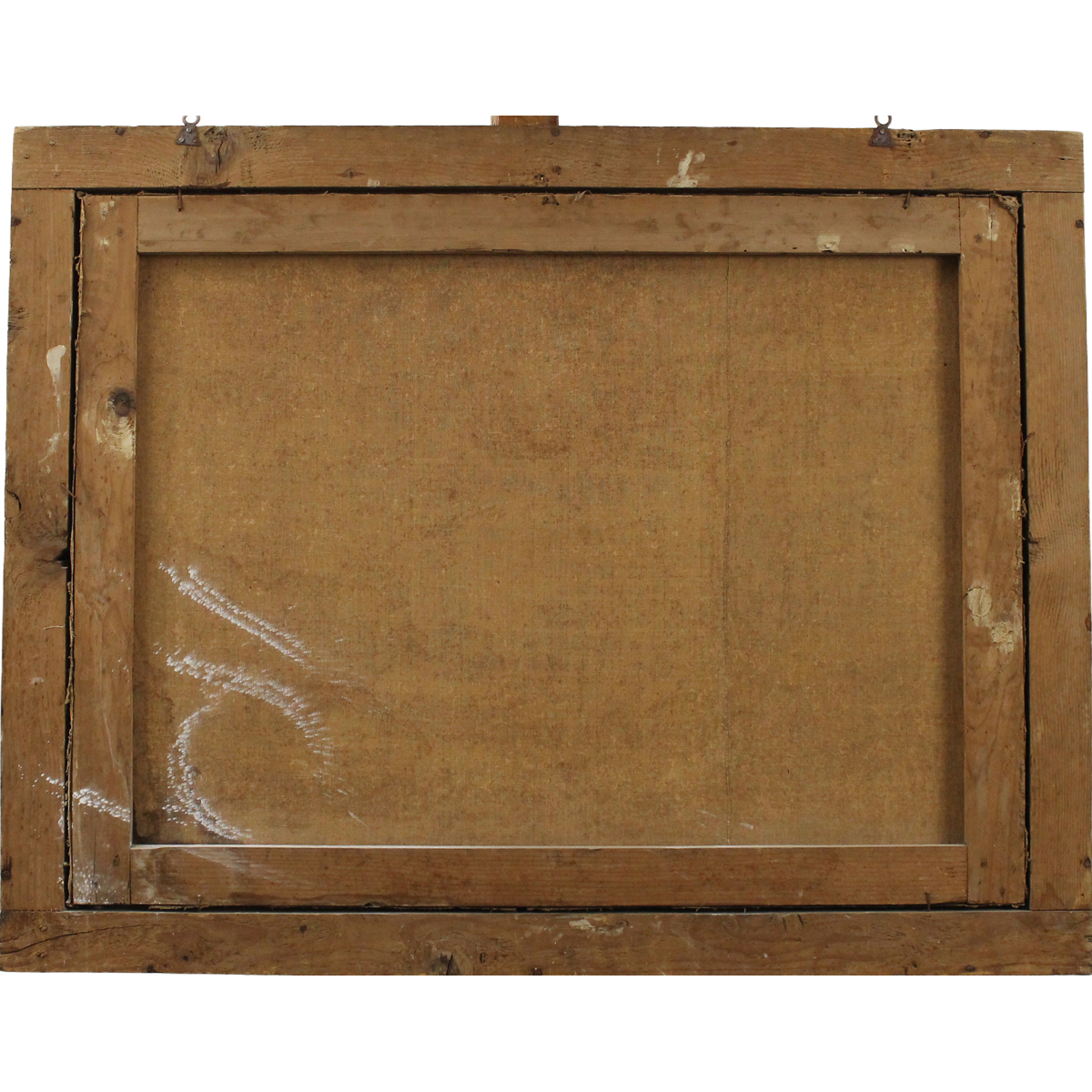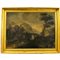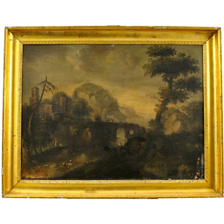 Scuola dell'Italia settentrionale della fine del secolo XVIII "Veduta del castello sul fiume" Dipinto ad olio su tela in cornice in legno dorato a canna spaccata (mancanze, restauri e vecchio rifodero). Cm 76x101
