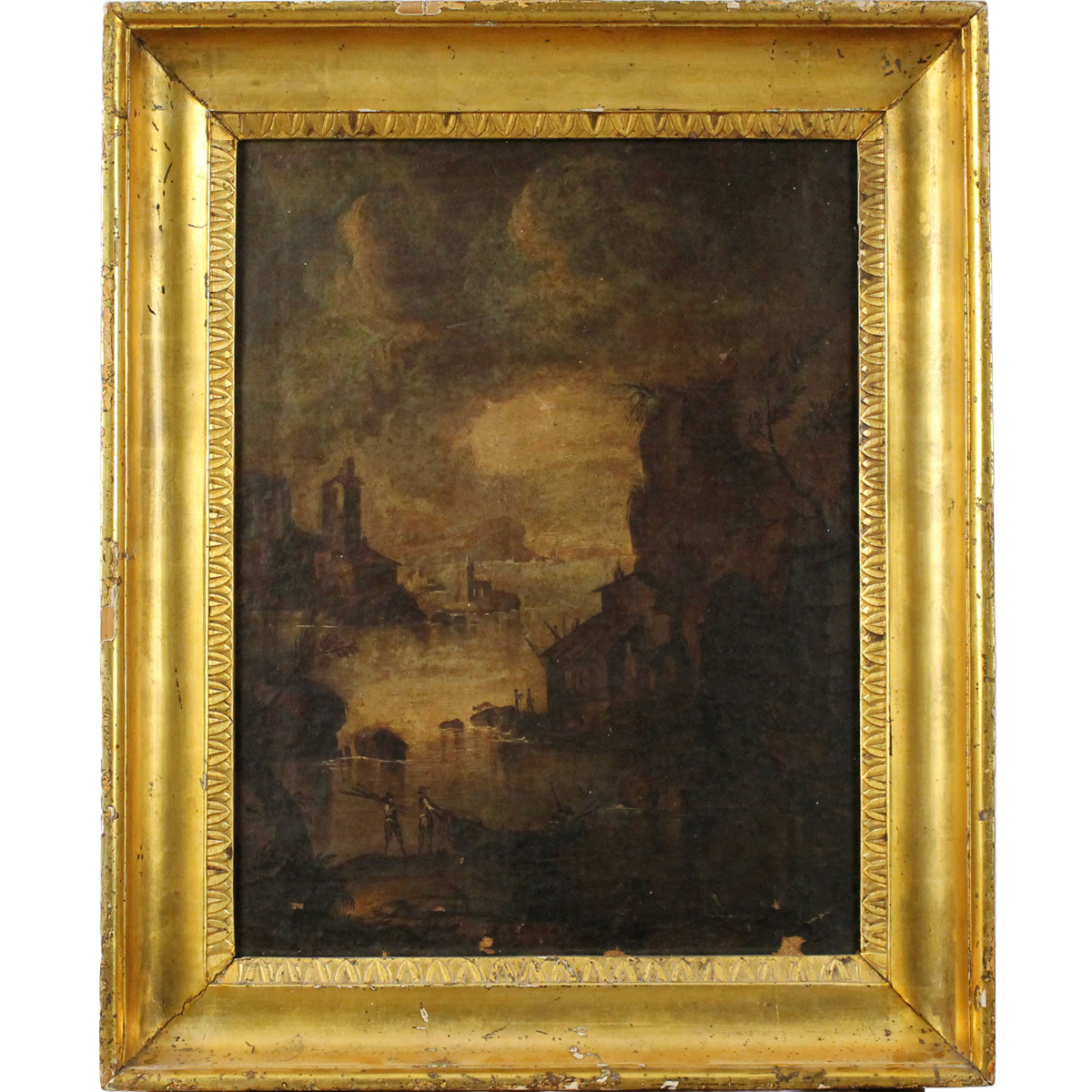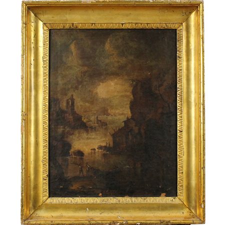 Scuola dell'Italia settentrionale della fine del secolo XVIII "Marina dal promontorio" Dipinto ad olio su tela in cornice in legno dorato a canna spaccata (lievi restauri e vecchio rifodero). Cm 51x39