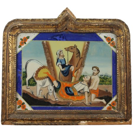 Scuola siciliana degli inizi del secolo XIX "Scena sacra" Dipinto ad olio su vetro in cornice in legno dorato. Cm 46x59