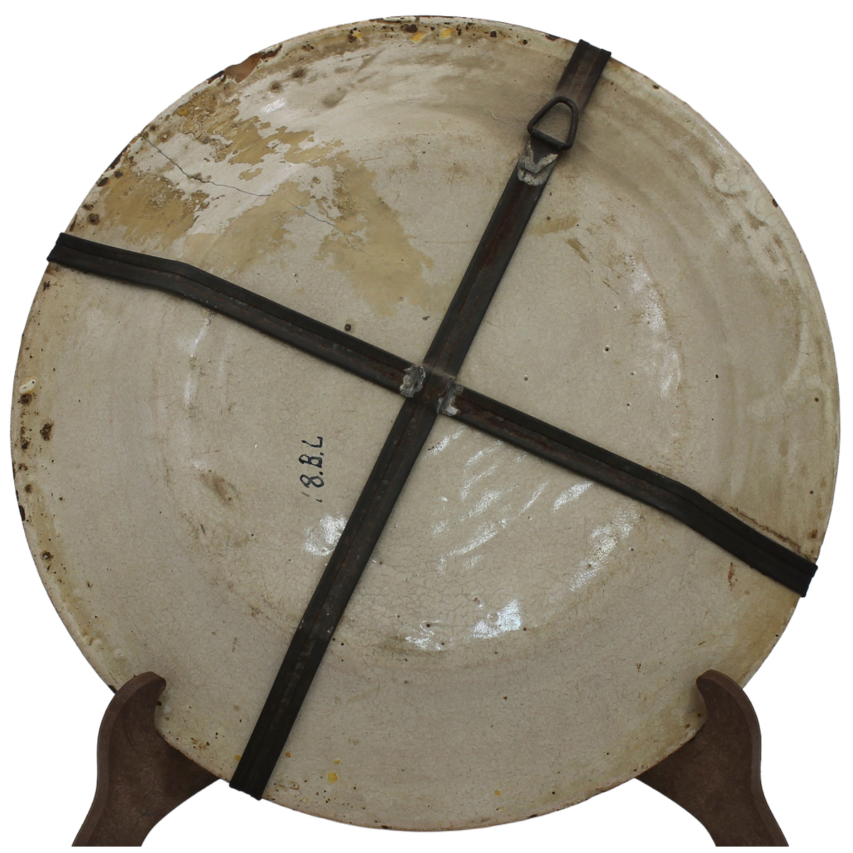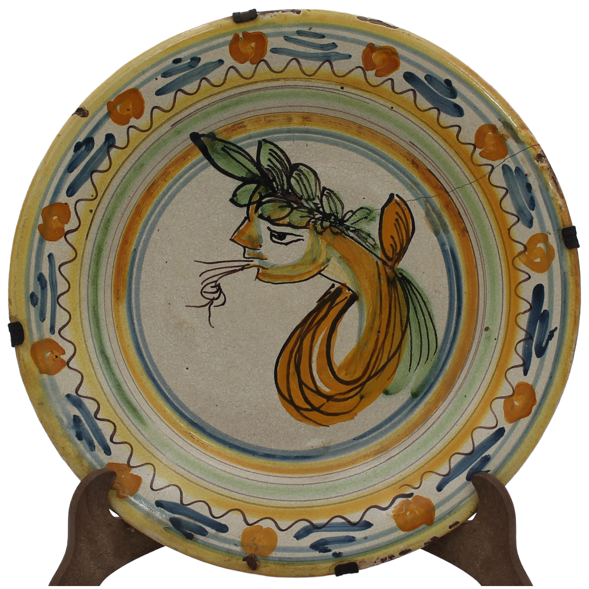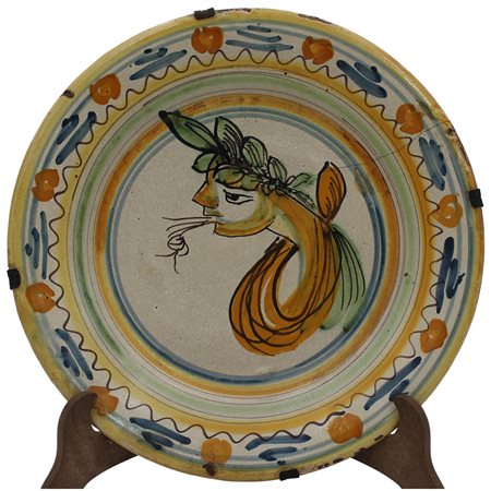 Piatto Antica maiolica con decoro policromo a figura antropomorfa (failiure e restauri sul retro). Italia meridionale. Secolo XIX. Cm d 29