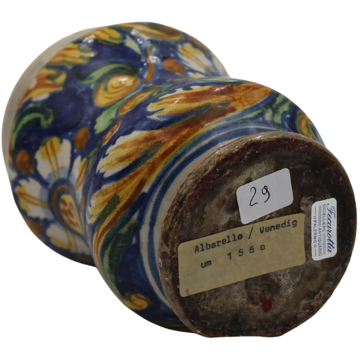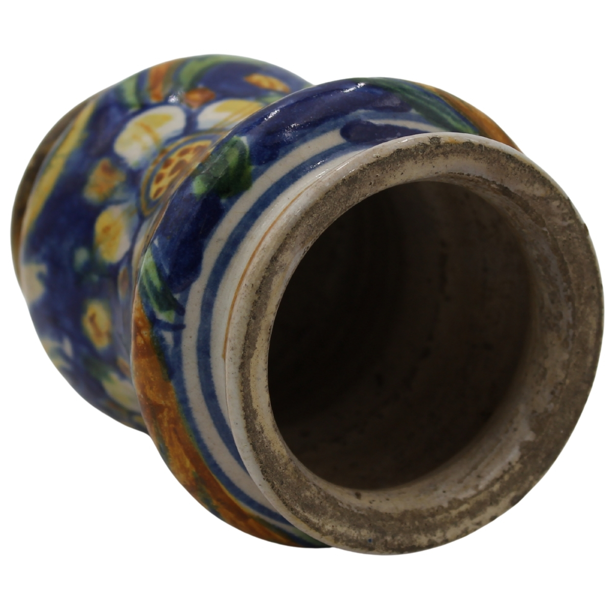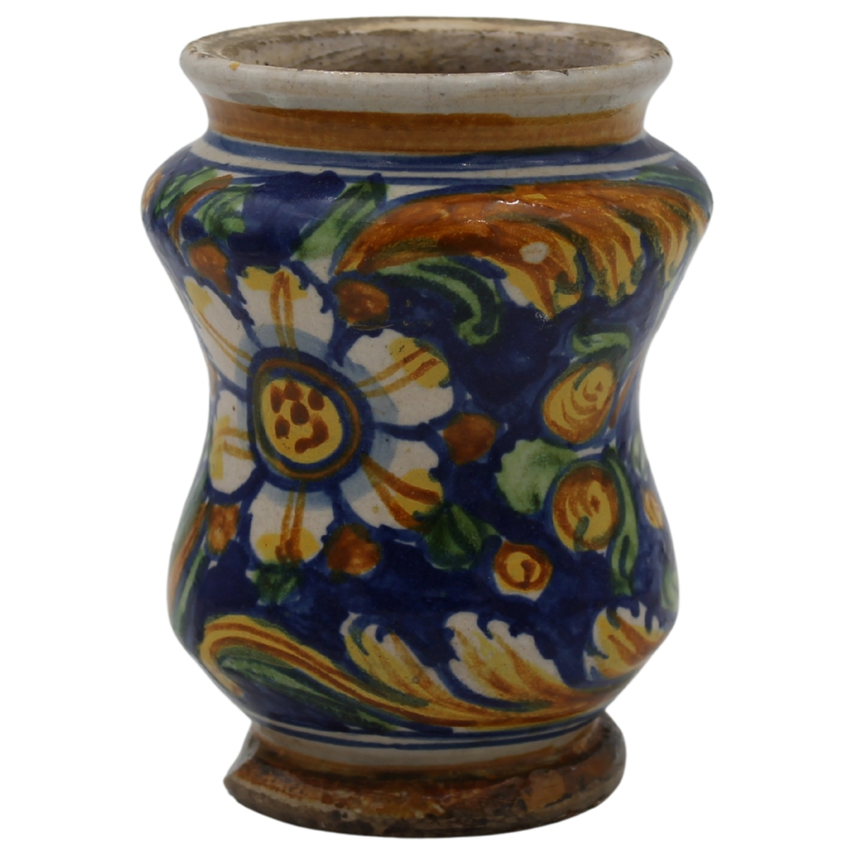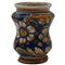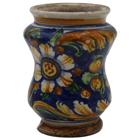 Piccolo albarello Antica maiolica con decoro a tutto tondo amotivi floreali e vegetali policromi. Calabria. Fine secolo XVIII. Cm h 14
