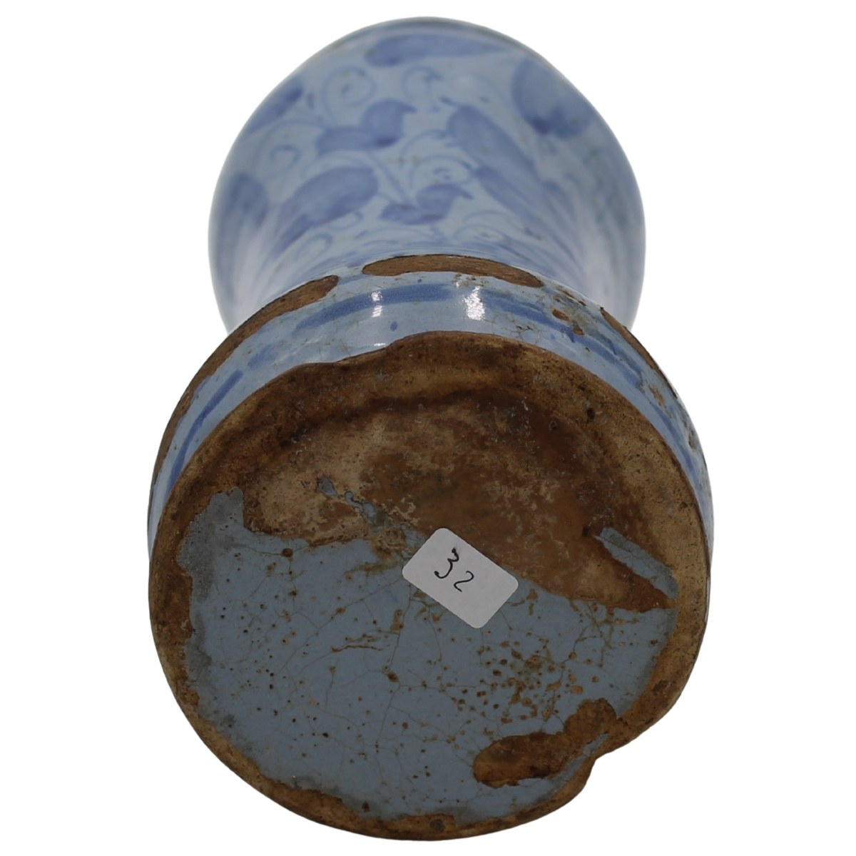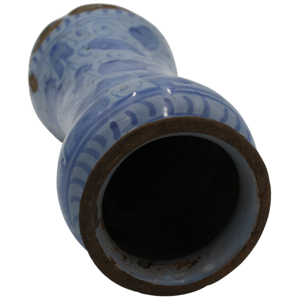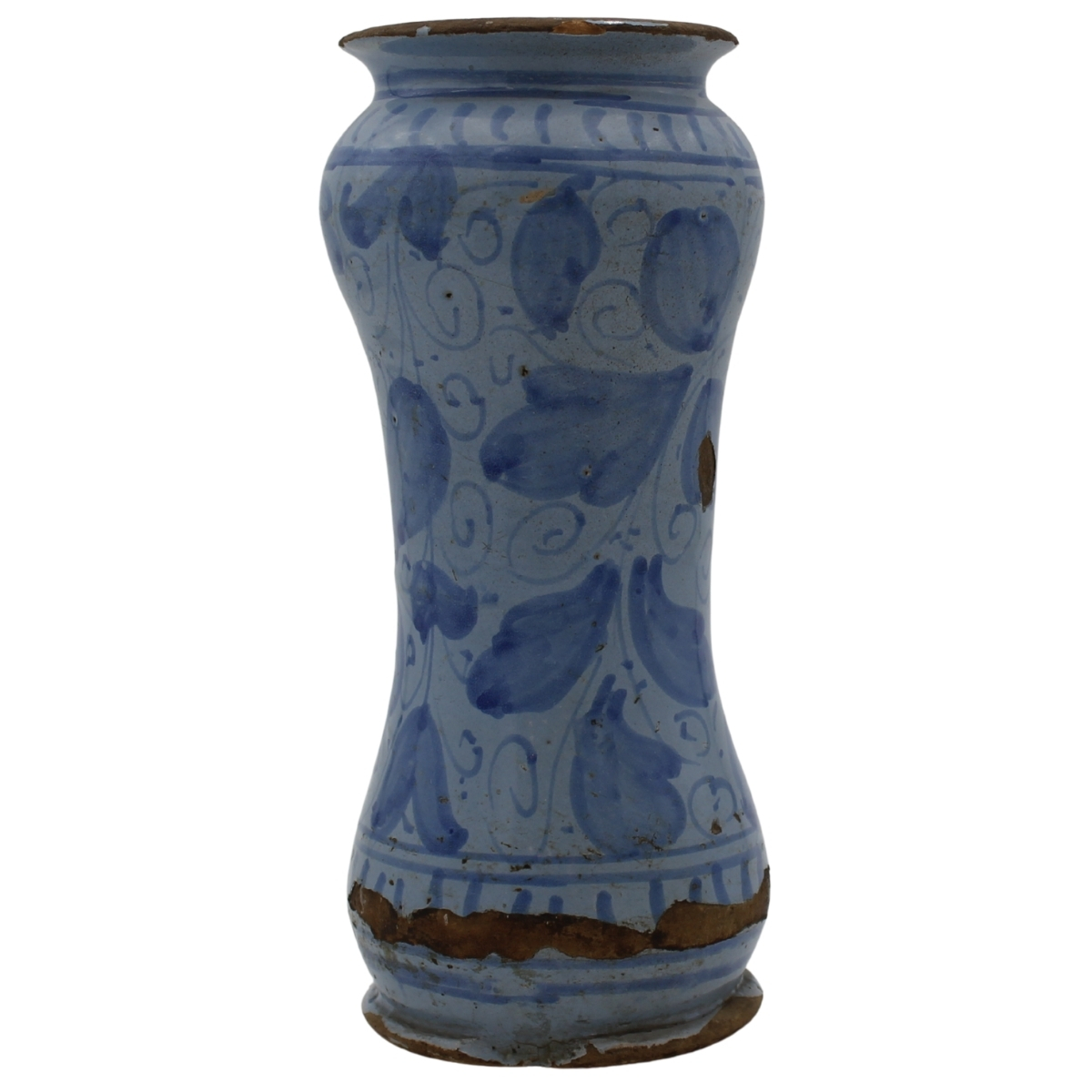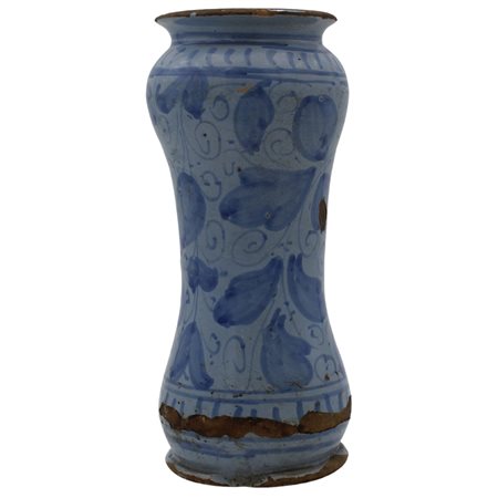 Albarello turchino Antica maiolica con decoro a tutto tondo a motivi vegetali policromi (mancanze di smalto). Italia settentrionale. Fine secolo XVIII. Cm h 28,5